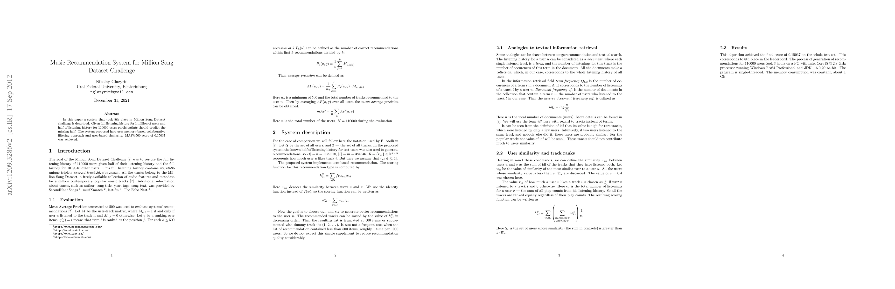 In this paper a system that took 8th place in Million Song Dataset challenge is described. Given full listening history for 1 million of users and half of listening history for 110000 users participatints should predict the missing half. The system proposed here uses memory-based collaborative filtering approach and user-based similarity. MAP@500 score of 0.15037 was achieved.