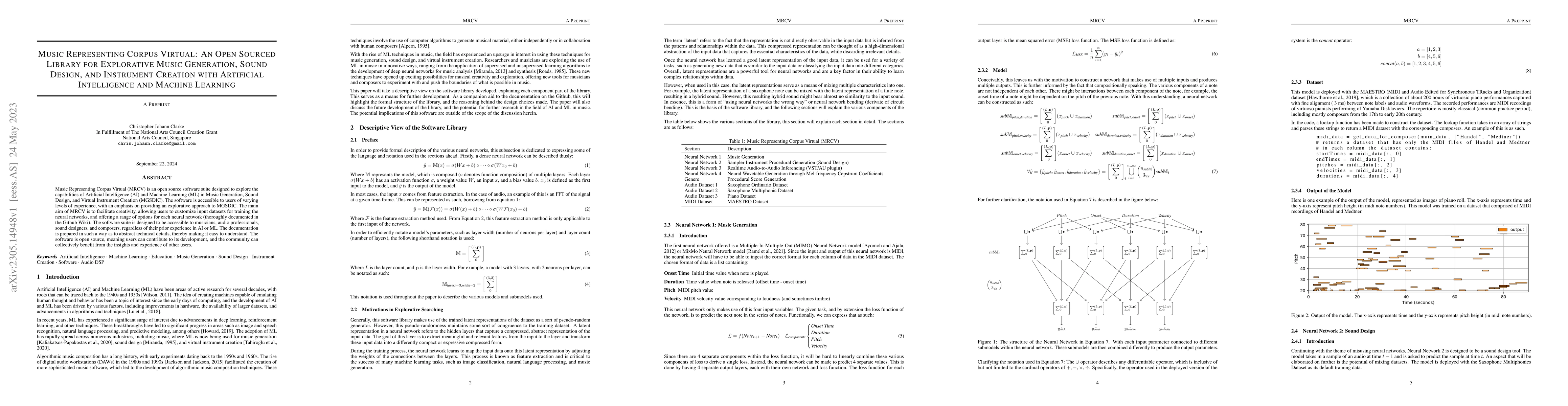 Music Representing Corpus Virtual (MRCV) is an open source software suite designed to explore the capabilities of Artificial Intelligence (AI) and Machine Learning (ML) in Music Generation, Sound Design, and Virtual Instrument Creation (MGSDIC). The software is accessible to users of varying levels of experience, with an emphasis on providing an explorative approach to MGSDIC. The main aim of MRCV is to facilitate creativity, allowing users to customize input datasets for training the neural networks, and offering a range of options for each neural network (thoroughly documented in the Github Wiki). The software suite is designed to be accessible to musicians, audio professionals, sound designers, and composers, regardless of their prior experience in AI or ML. The documentation is prepared in such a way as to abstract technical details, thereby making it easy to understand. The software is open source, meaning users can contribute to its development, and the community can collectively benefit from the insights and experience of other users.