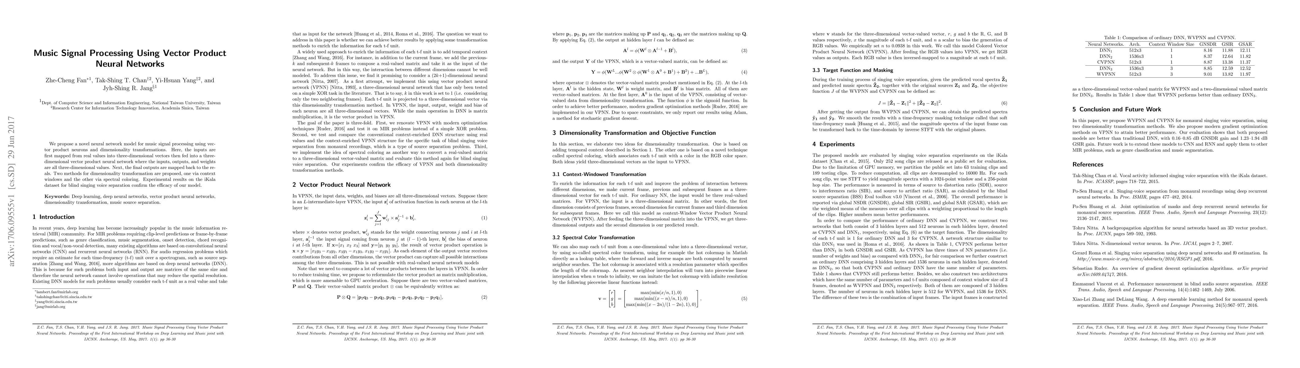 Researchers developed a neural network model for music signal processing using vector product neurons and dimensionality transformations, achieving effective voice separation results on the iKala dataset.