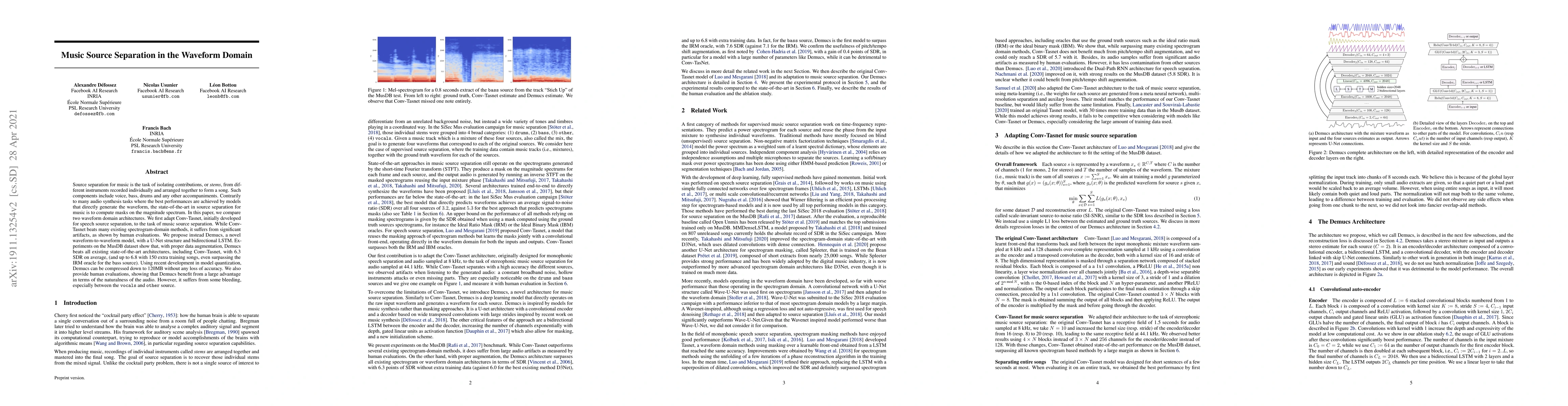 Source separation for music is the task of isolating contributions, or stems, from different instruments recorded individually and arranged together to form a song. Such components include voice, bass, drums and any other accompaniments.Contrarily to many audio synthesis tasks where the best performances are achieved by models that directly generate the waveform, the state-of-the-art in source separation for music is to compute masks on the magnitude spectrum. In this paper, we compare two waveform domain architectures. We first adapt Conv-Tasnet, initially developed for speech source separation,to the task of music source separation. While Conv-Tasnet beats many existing spectrogram-domain methods, it suffersfrom significant artifacts, as shown by human evaluations. We propose instead Demucs, a novel waveform-to-waveform model,with a U-Net structure and bidirectional LSTM.Experiments on the MusDB dataset show that, with proper data augmentation, Demucs beats allexisting state-of-the-art architectures, including Conv-Tasnet, with 6.3 SDR on average, (and up to 6.8 with 150 extra training songs, even surpassing the IRM oracle for the bass source).Using recent development in model quantization, Demucs can be compressed down to 120MBwithout any loss of accuracy.We also provide human evaluations, showing that Demucs benefit from a large advantagein terms of the naturalness of the audio. However, it suffers from some bleeding,especially between the vocals and other source.