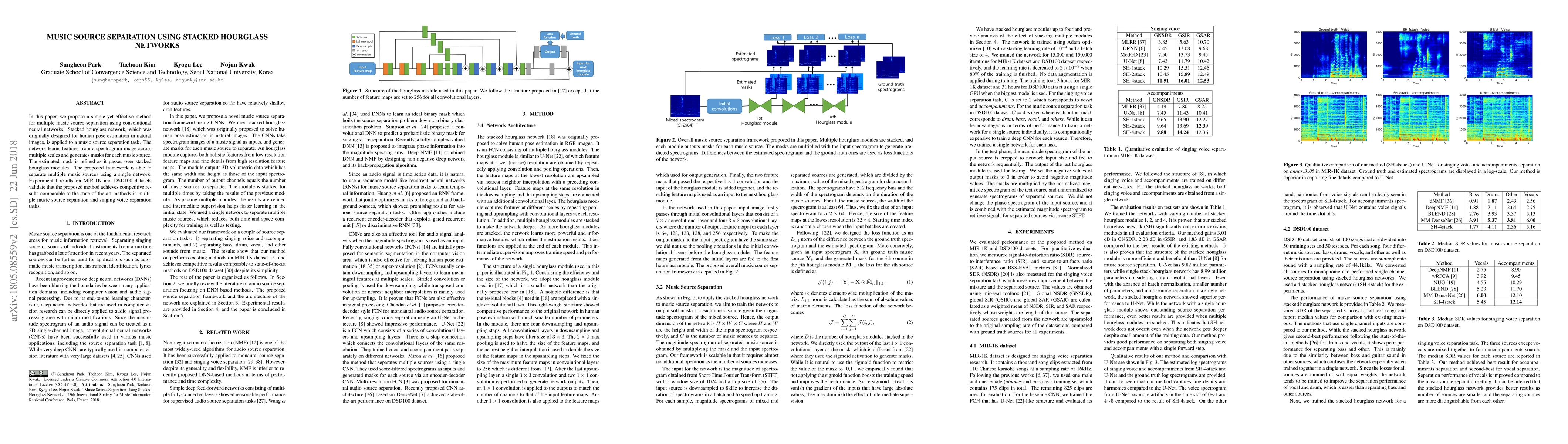 This paper proposes a stacked hourglass network for multiple music source separation, utilizing spectrogram images to generate refined masks for each source. Experimental results show competitive performance against state-of-the-art methods on MIR-1K and DSD100 datasets.