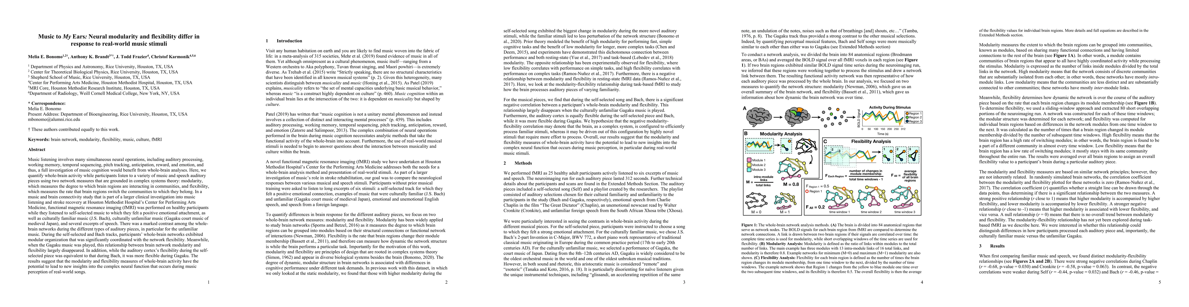 This study investigates whole-brain activity using fMRI while participants listen to various music and speech stimuli, measuring neural modularity and flexibility. Results show that familiar music maintains a coordinated relationship between modularity and flexibility, while unfamiliar music disrupts this coordination, indicating different neural processing strategies for real-world music stimuli.
