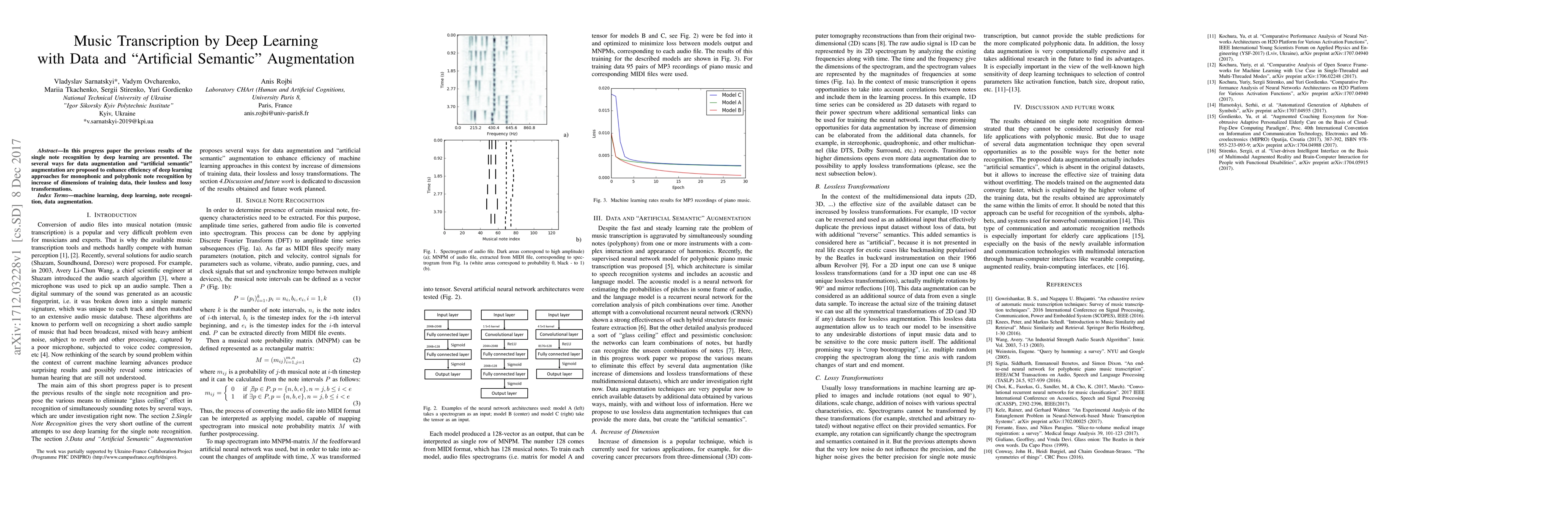 In this progress paper the previous results of the single note recognition by deep learning are presented. The several ways for data augmentation and "artificial semantic" augmentation are proposed to enhance efficiency of deep learning approaches for monophonic and polyphonic note recognition by increase of dimensions of training data, their lossless and lossy transformations.