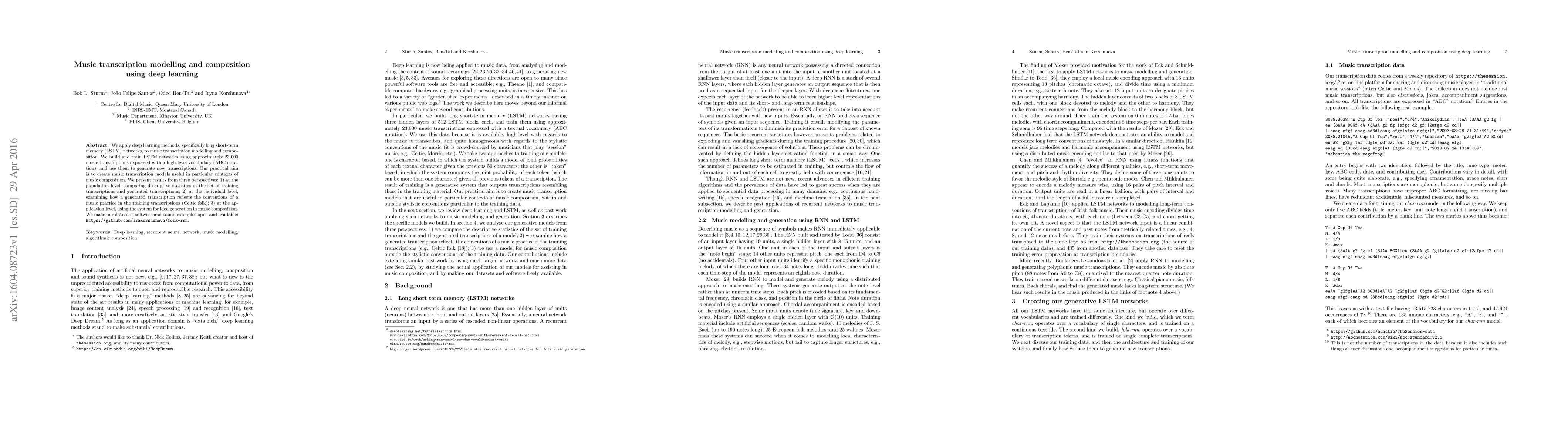 This paper employs LSTM networks for music transcription modelling and composition, trained on 23,000 transcriptions in ABC notation. It evaluates the model's effectiveness at population, individual, and application levels, and makes datasets and software publicly available for music composition idea generation.