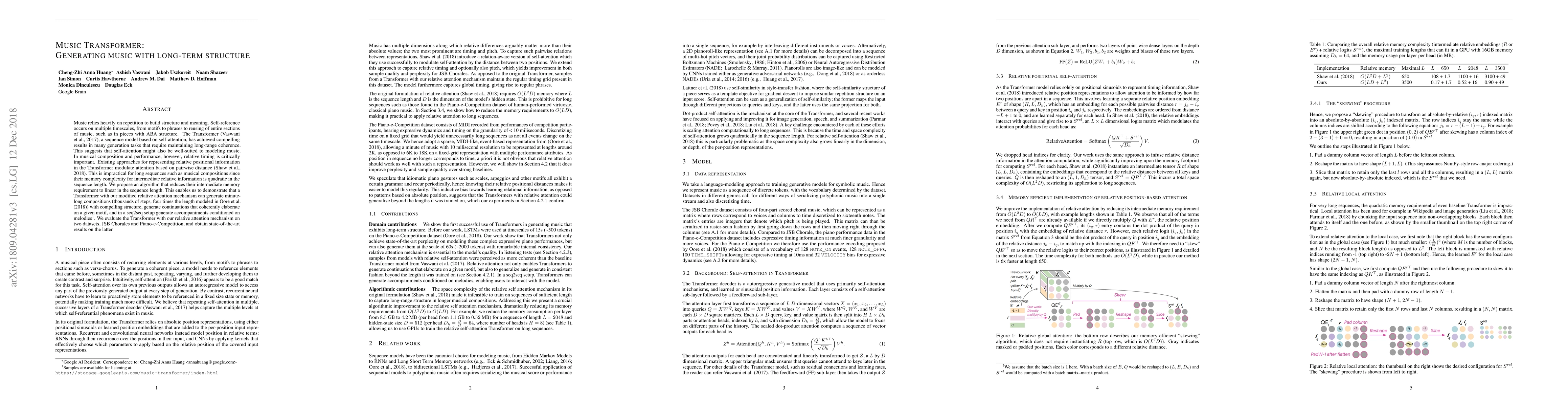 Music relies heavily on repetition to build structure and meaning. Self-reference occurs on multiple timescales, from motifs to phrases to reusing of entire sections of music, such as in pieces with ABA structure. The Transformer (Vaswani et al., 2017), a sequence model based on self-attention, has achieved compelling results in many generation tasks that require maintaining long-range coherence. This suggests that self-attention might also be well-suited to modeling music. In musical composition and performance, however, relative timing is critically important. Existing approaches for representing relative positional information in the Transformer modulate attention based on pairwise distance (Shaw et al., 2018). This is impractical for long sequences such as musical compositions since their memory complexity for intermediate relative information is quadratic in the sequence length. We propose an algorithm that reduces their intermediate memory requirement to linear in the sequence length. This enables us to demonstrate that a Transformer with our modified relative attention mechanism can generate minute-long compositions (thousands of steps, four times the length modeled in Oore et al., 2018) with compelling structure, generate continuations that coherently elaborate on a given motif, and in a seq2seq setup generate accompaniments conditioned on melodies. We evaluate the Transformer with our relative attention mechanism on two datasets, JSB Chorales and Piano-e-Competition, and obtain state-of-the-art results on the latter.