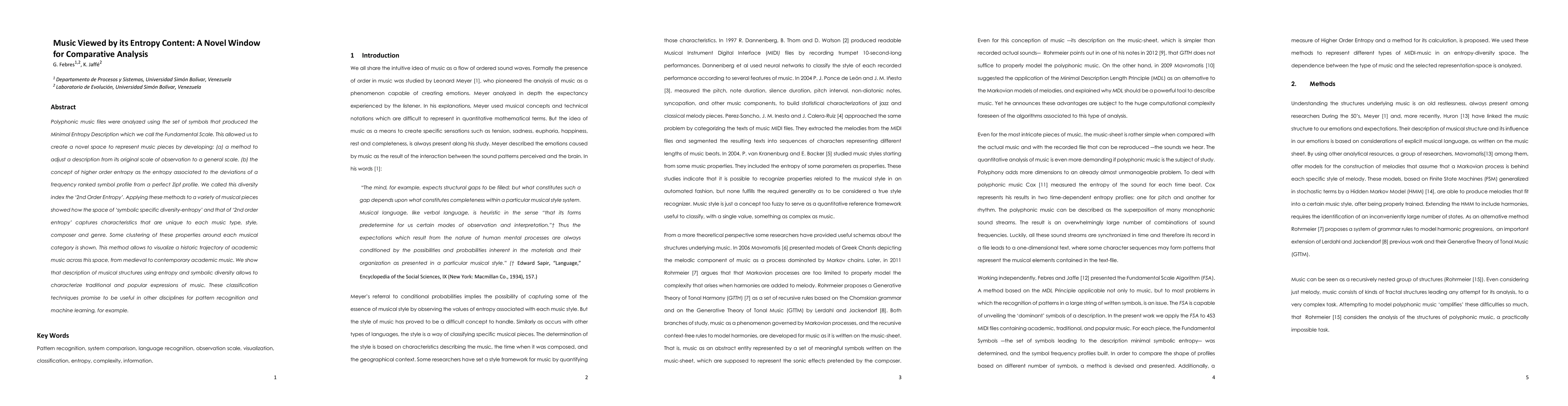 Polyphonic music files were analyzed using the set of symbols that produced the Minimal Entropy Description which we call the Fundamental Scale. This allowed us to create a novel space to represent music pieces by developing: a) a method to adjust a description from its original scale of observation to a general scale, b) the concept of higher order entropy as the entropy associated to the deviations of a frequency ranked symbol profile from a perfect Zipf profile. We called this diversity index the "2nd Order Entropy". Applying these methods to a variety of musical pieces showed how the space of "symbolic specific diversity-entropy" and that of "2nd order entropy" captures characteristics that are unique to each music type, style, composer and genre. Some clustering of these properties around each musical category is shown. This method allows to visualize a historic trajectory of academic music across this space, from medieval to contemporary academic music. We show that description of musical structures using entropy and symbolic diversity allows to characterize traditional and popular expressions of music. These classification techniques promise to be useful in other disciplines for pattern recognition and machine learning, for example.