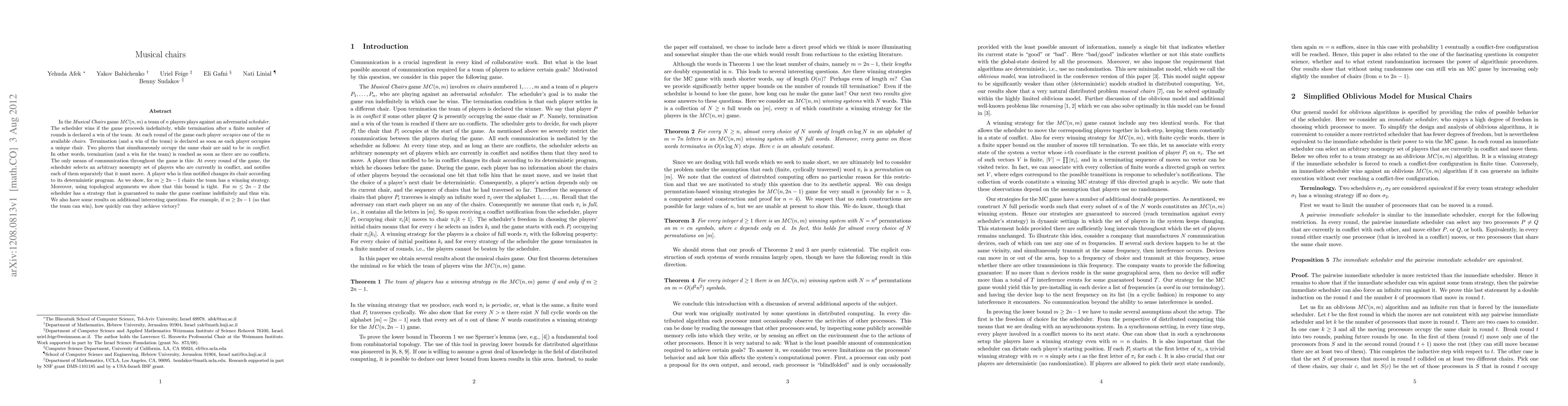 The research paper 'Musical Chairs' analyzes a game between a team of n players and an adversarial scheduler with m chairs. The team wins if they occupy unique chairs (no conflicts), otherwise the scheduler wins. The paper proves the team has a winning strategy when m >= 2n-1, with this bound being tight, and provides a scheduler's winning strategy for m <= 2n-2. Additional insights are offered on the team's victory speed under optimal conditions.