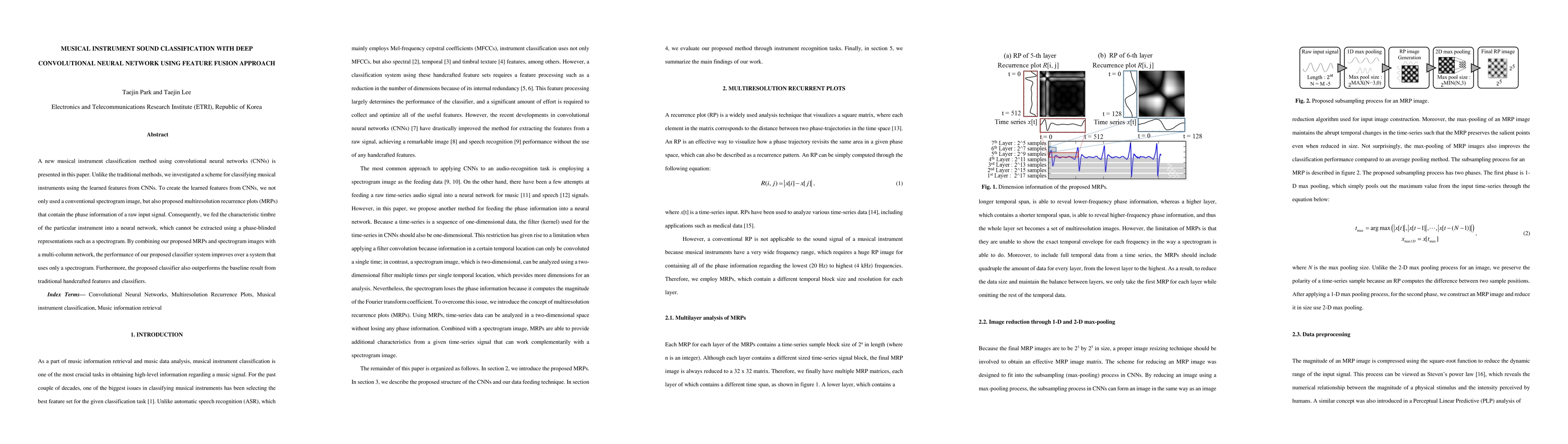 This paper introduces a novel musical instrument classification method using deep convolutional neural networks (CNNs) that fuses spectrogram images and multiresolution recurrence plots (MRPs) to capture phase information. The combined feature fusion approach enhances the classifier's performance, outperforming traditional methods that rely on handcrafted features.
