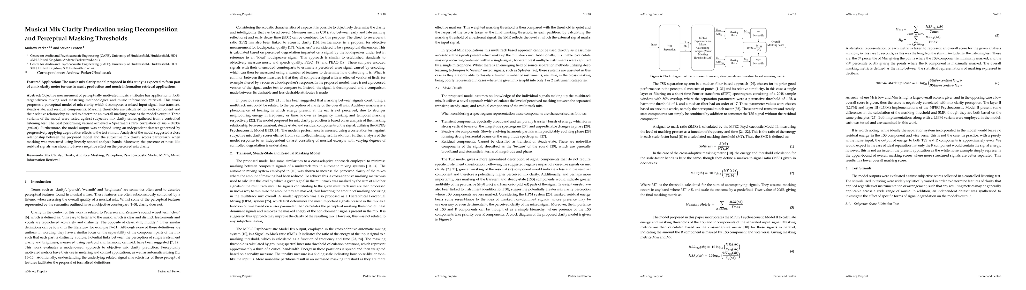 Objective measurement of perceptually motivated music attributes has application in both target driven mixing and mastering methodologies and music information retrieval. This work proposes a perceptual model of mix clarity which decomposes a mixed input signal into transient, steady-state, and residual components. Masking thresholds are calculated for each component and their relative relationship is used to determine an overall masking score as the model's output. Three variants of the model were tested against subjective mix clarity scores gathered from a controlled listening test. The best performing variant achieved a Spearman's rank correlation of rho = 0.8382 (p<0.01). Furthermore, the model output was analysed using an independent dataset generated by progressively applying degradation effects to the test stimuli. Analysis of the model suggested a close relationship between the proposed model and the subjective mix clarity scores particularly when masking was measured using linearly spaced analysis bands. Moreover, the presence of noise-like residual signals was shown to have a negative effect on the perceived mix clarity.