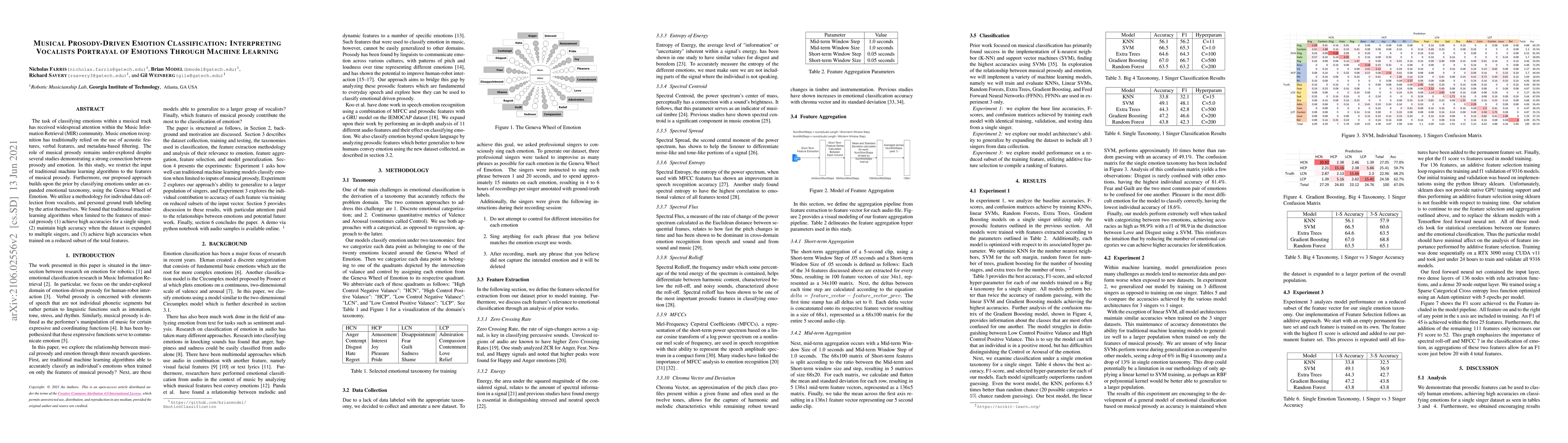 This study explores the classification of emotions in music using musical prosody features, finding that traditional machine learning algorithms achieve high accuracy when limited to prosody, even when trained on data from multiple vocalists and reduced feature sets. The research employs an expanded emotional taxonomy based on the Geneva Wheel of Emotion and utilizes vocalists' self-labeling for ground truth data collection.