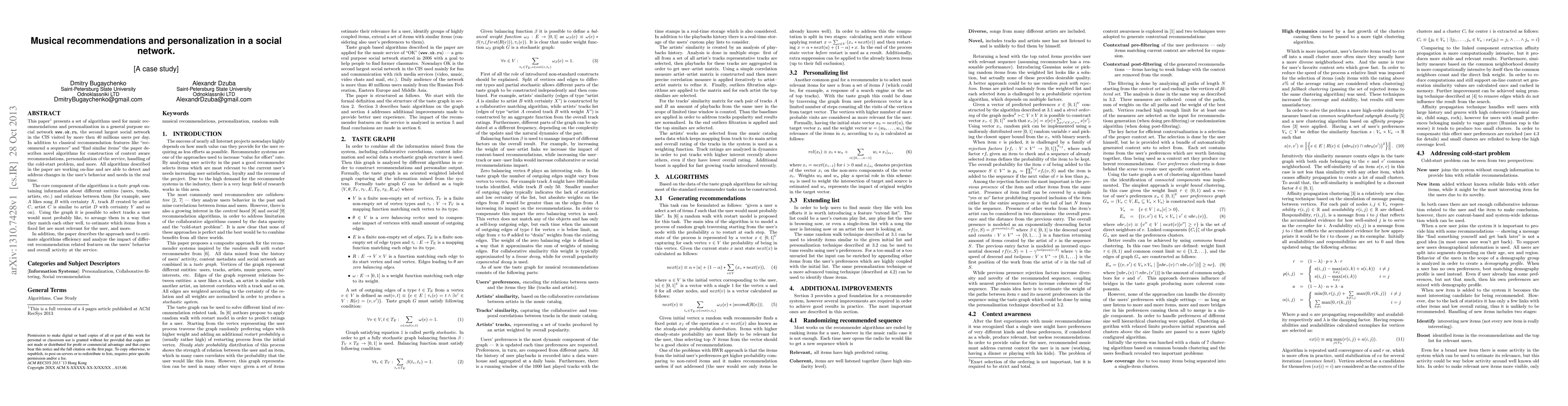 This paper presents a set of algorithms used for music recommendations and personalization in a general purpose social network www.ok.ru, the second largest social network in the CIS visited by more then 40 millions users per day. In addition to classical recommendation features like "recommend a sequence" and "find similar items" the paper describes novel algorithms for construction of context aware recommendations, personalization of the service, handling of the cold-start problem, and more. All algorithms described in the paper are working on-line and are able to detect and address changes in the user's behavior and needs in the real time. The core component of the algorithms is a taste graph containing information about different entities (users, tracks, artists, etc.) and relations between them (for example, user A likes song B with certainty X, track B created by artist C, artist C is similar to artist D with certainty Y and so on). Using the graph it is possible to select tracks a user would most probably like, to arrange them in a way that they match each other well, to estimate which items from a fixed list are most relevant for the user, and more. In addition, the paper describes the approach used to estimate algorithms efficiency and analyze the impact of different recommendation related features on the users' behavior and overall activity at the service.