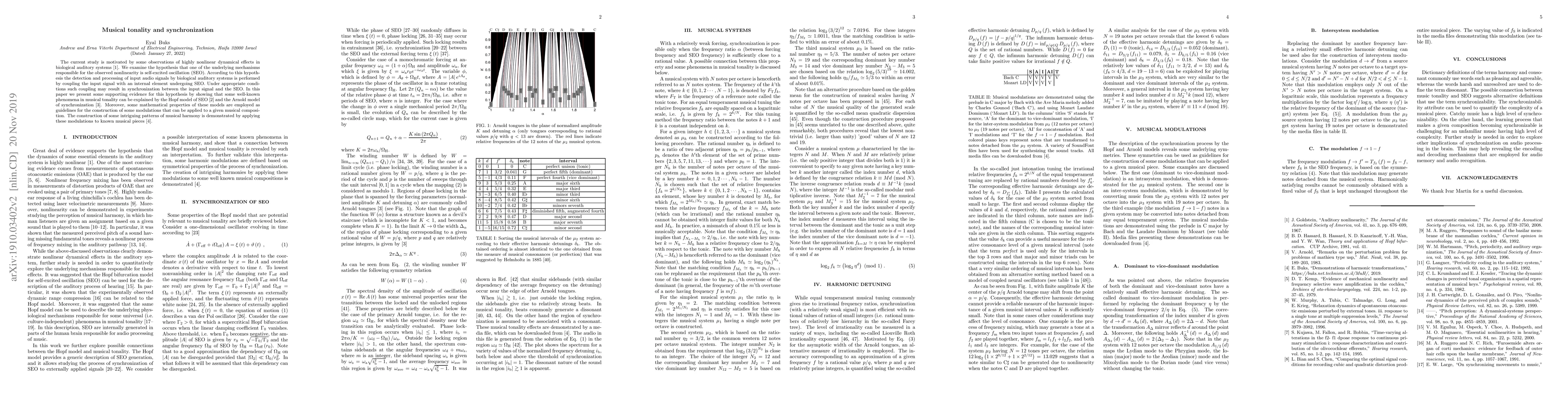 The current study is motivated by some observations of highly nonlinear dynamical effects in biological auditory systems. We examine the hypothesis that one of the underlying mechanisms responsible for the observed nonlinearity is self-excited oscillation (SEO). According to this hypothesis the detection and processing of input audio signals by biological auditory systems is performed by coupling the input signal with an internal element undergoing SEO. Under appropriate conditions such coupling may result in synchronization between the input signal and the SEO. In this paper we present some supporting evidence for this hypothesis by showing that some well-known phenomena in musical tonality can be explained by the Hopf model of SEO and the Arnold model of synchronization. Moreover, some mathematical properties of these models are employed as guidelines for the construction of some modulations that can be applied to a given musical composition. The construction of some intriguing patterns of musical harmony is demonstrated by applying these modulations to known musical pieces.