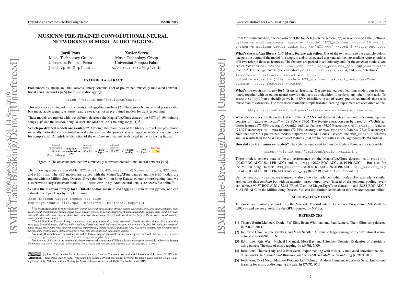 The musicnn library offers pre-trained convolutional neural networks for music audio tagging, achieving state-of-the-art results on datasets like MagnaTagATune and Million Song. It also provides tools for training and implementing novel models, including attention-based architectures.