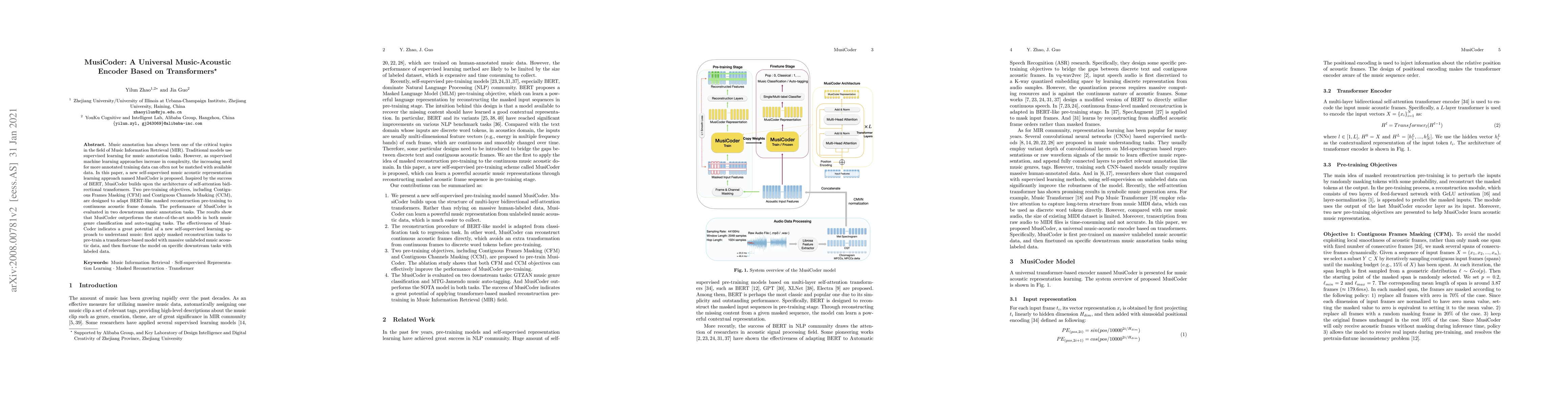Music annotation has always been one of the critical topics in the field of Music Information Retrieval (MIR). Traditional models use supervised learning for music annotation tasks. However, as supervised machine learning approaches increase in complexity, the increasing need for more annotated training data can often not be matched with available data. In this paper, a new self-supervised music acoustic representation learning approach named MusiCoder is proposed. Inspired by the success of BERT, MusiCoder builds upon the architecture of self-attention bidirectional transformers. Two pre-training objectives, including Contiguous Frames Masking (CFM) and Contiguous Channels Masking (CCM), are designed to adapt BERT-like masked reconstruction pre-training to continuous acoustic frame domain. The performance of MusiCoder is evaluated in two downstream music annotation tasks. The results show that MusiCoder outperforms the state-of-the-art models in both music genre classification and auto-tagging tasks. The effectiveness of MusiCoder indicates a great potential of a new self-supervised learning approach to understand music: first apply masked reconstruction tasks to pre-train a transformer-based model with massive unlabeled music acoustic data, and then finetune the model on specific downstream tasks with labeled data.
