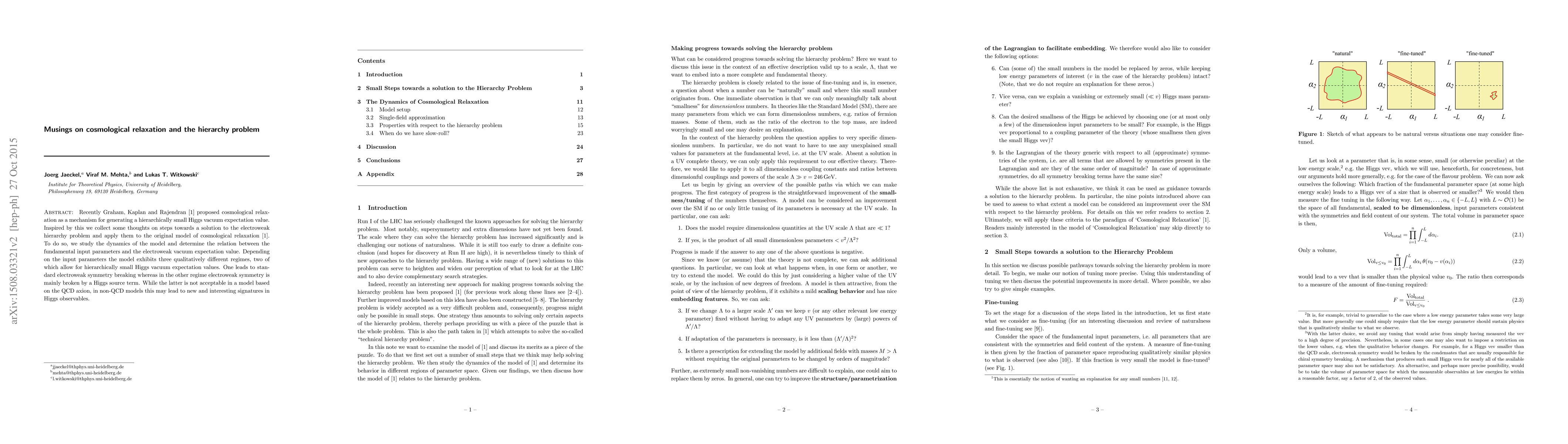 Recently Graham, Kaplan and Rajendran [1] proposed cosmological relaxation as a mechanism for generating a hierarchically small Higgs vacuum expectation value. Inspired by this we collect some thoughts on steps towards a solution to the electroweak hierarchy problem and apply them to the original model of cosmological relaxation [1]. To do so, we study the dynamics of the model and determine the relation between the fundamental input parameters and the electroweak vacuum expectation value. Depending on the input parameters the model exhibits three qualitatively different regimes, two of which allow for hierarchically small Higgs vacuum expectation values. One leads to standard electroweak symmetry breaking whereas in the other regime electroweak symmetry is mainly broken by a Higgs source term. While the latter is not acceptable in a model based on the QCD axion, in non-QCD models this may lead to new and interesting signatures in Higgs observables.
