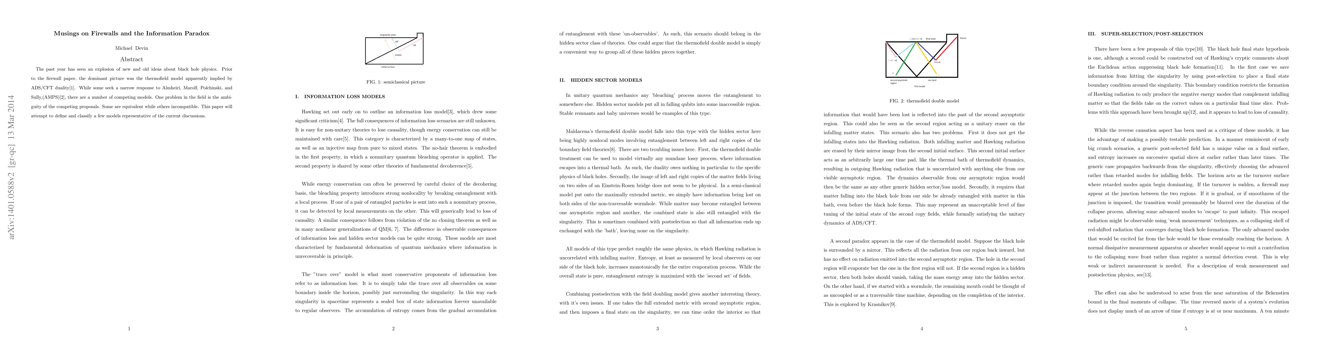 The past year has seen an explosion of new and old ideas about black hole physics. Prior to the firewall paper, the dominant picture was the thermofield model apparently implied by ADS/CFT duality\cite{mal2}. While some seek a narrow responce to Almheiri, Marolf, Polchinski, and Sully,(AMPS)\cite{amps}, there are a number of competing models. One problem in the field is the ambiguity of the competing proposals. Some are equivalent while others incompatible. This paper will attempt to define and classify a few models representative of the current discussions.