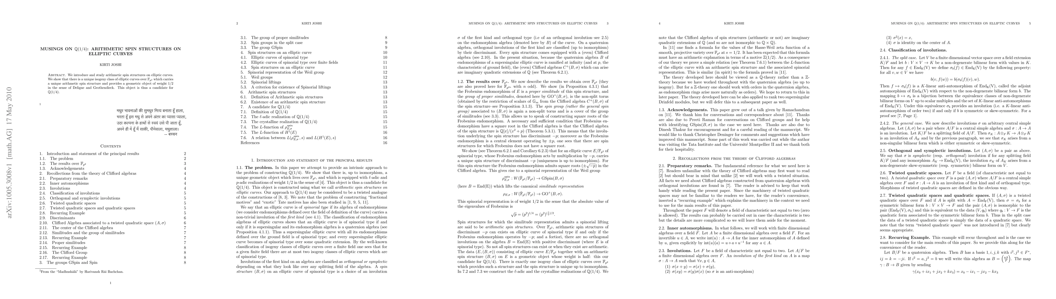 We introduce and study arithmetic spin structures on elliptic curves. We show that there is a unique isogeny class of elliptic curves over $\F_{p^2}$ which carries a unique arithmetic spin structure and provides a geometric object of weight 1/2 in the sense of Deligne and Grothendieck. This object is thus a candidate for $\Q(1/4)$.