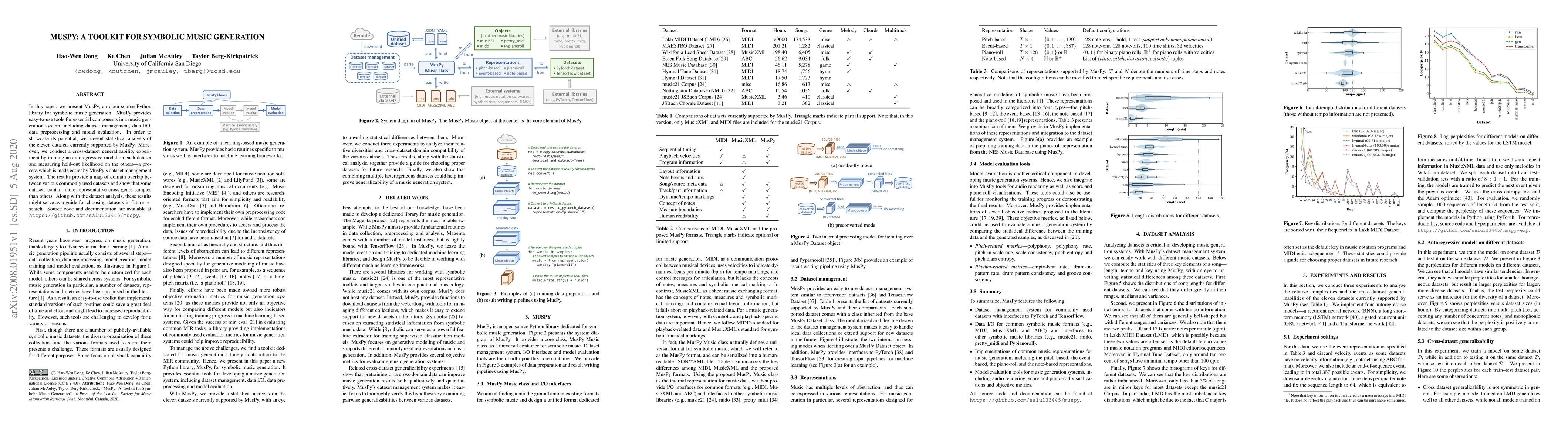 MusPy is an open-source Python library for symbolic music generation, offering tools for dataset management, data preprocessing, and model evaluation. The paper also analyzes dataset overlap and cross-genre generalizability, providing insights to guide future research choices.