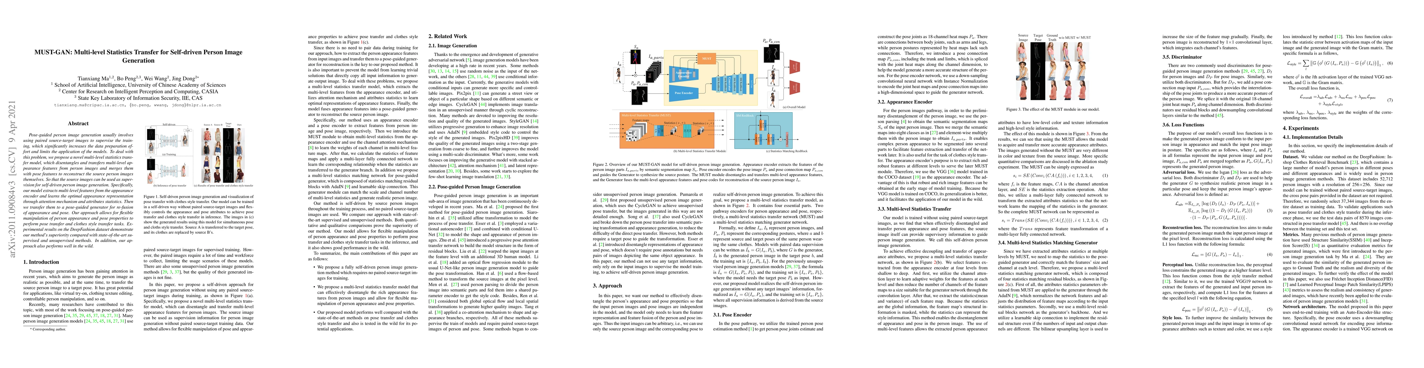 MUST-GAN proposes a multi-level statistics transfer model for self-driven person image generation, disentangling and transferring appearance features without paired images. The method demonstrates superior performance in pose and style transfer tasks compared to existing supervised and unsupervised approaches.