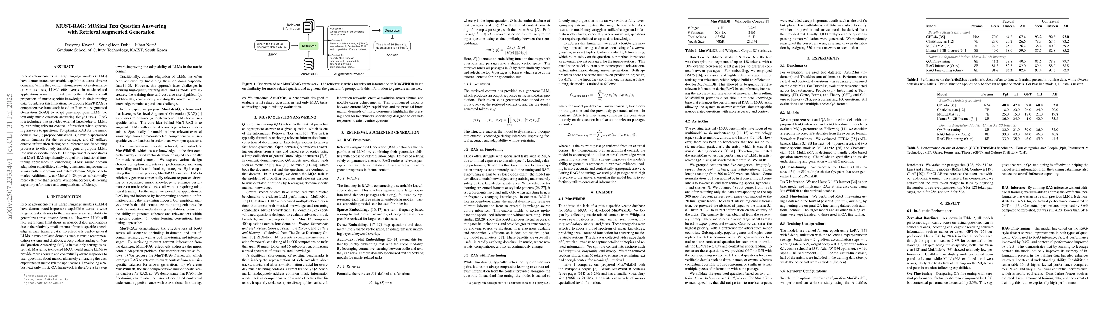 The research introduces MusT-RAG, a framework using Retrieval Augmented Generation (RAG) to adapt general-purpose language models for music question answering. MusT-RAG outperforms traditional fine-tuning methods, demonstrating significant improvements in both in-domain and out-of-domain music question answering benchmarks. It also presents MusWikiDB, a music-specialized vector database for efficient retrieval of context information, surpassing general Wikipedia corpora in performance and computational efficiency.