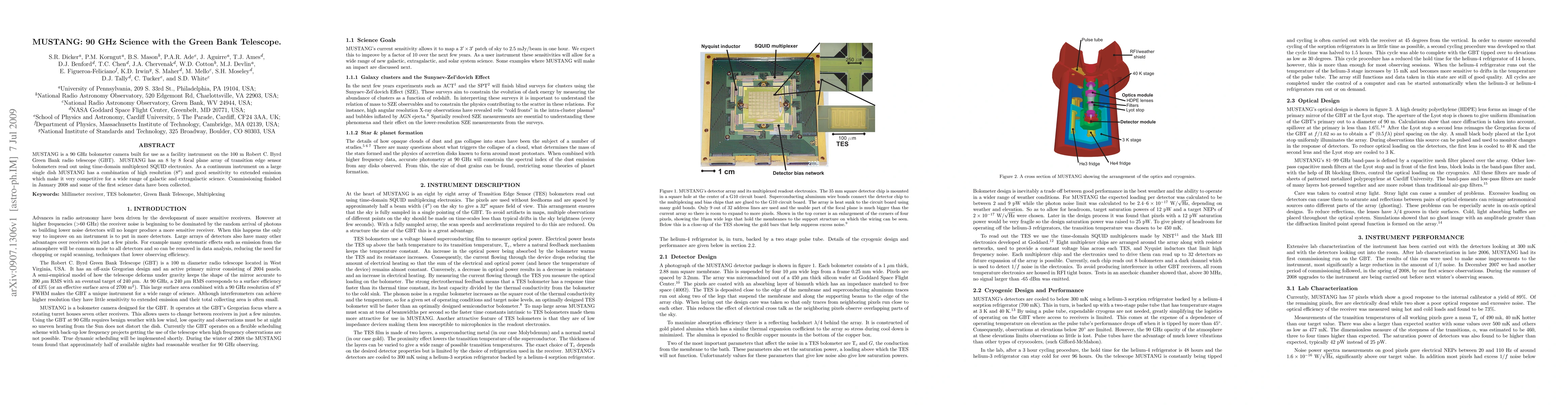 MUSTANG, a 90 GHz bolometer camera on the Green Bank Telescope, features an 8x8 array of transition edge sensor bolometers for high-resolution and sensitive continuum observations. It has been successfully commissioned for galactic and extragalactic science studies.