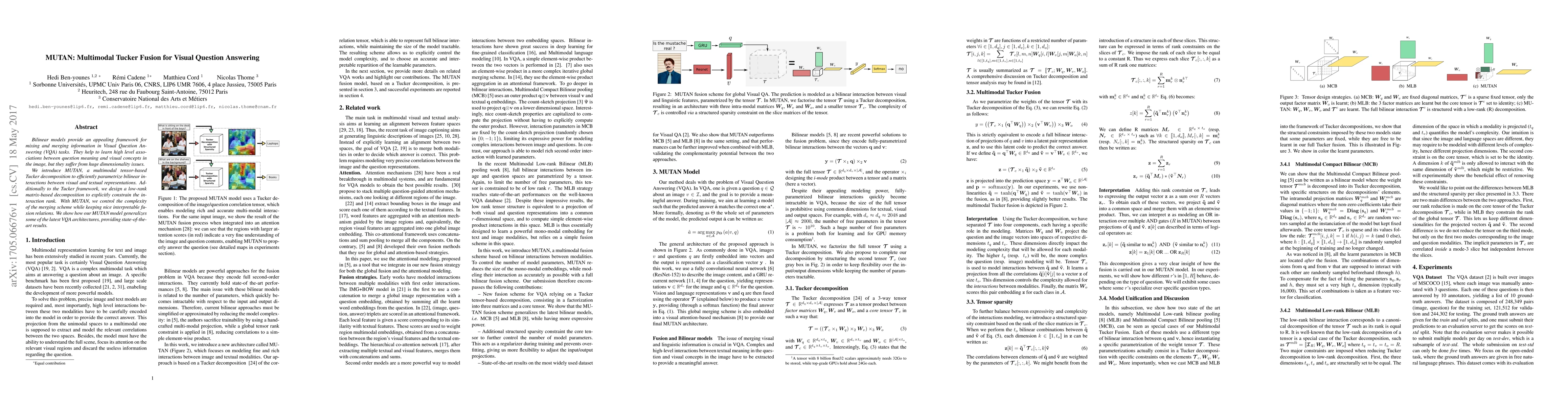 Bilinear models provide an appealing framework for mixing and merging information in Visual Question Answering (VQA) tasks. They help to learn high level associations between question meaning and visual concepts in the image, but they suffer from huge dimensionality issues. We introduce MUTAN, a multimodal tensor-based Tucker decomposition to efficiently parametrize bilinear interactions between visual and textual representations. Additionally to the Tucker framework, we design a low-rank matrix-based decomposition to explicitly constrain the interaction rank. With MUTAN, we control the complexity of the merging scheme while keeping nice interpretable fusion relations. We show how our MUTAN model generalizes some of the latest VQA architectures, providing state-of-the-art results.