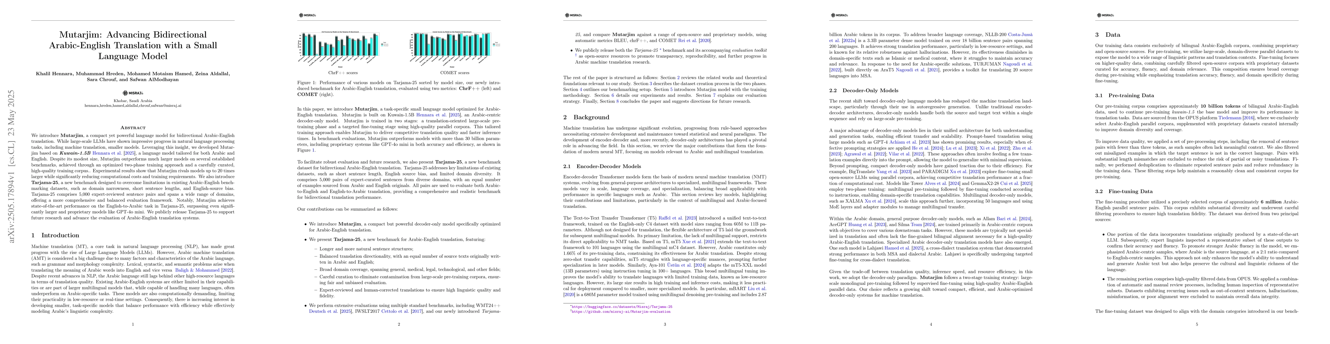 The research introduces Mutarjim, a small yet effective Arabic-English translation model, outperforming larger models with optimized training. A new benchmark, Tarjama-25, is also presented, offering a comprehensive evaluation of translation systems.
