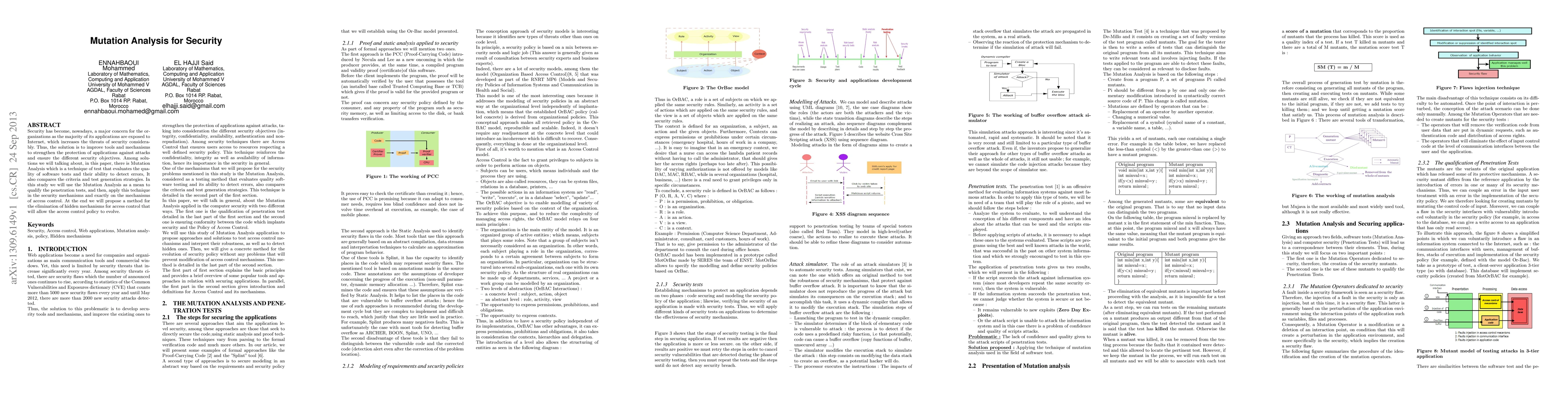 This paper explores Mutation Analysis for improving software security through evaluation of test quality and detection of errors in access control mechanisms. It proposes a method to eliminate hidden mechanisms and enable the evolution of access control policies.
