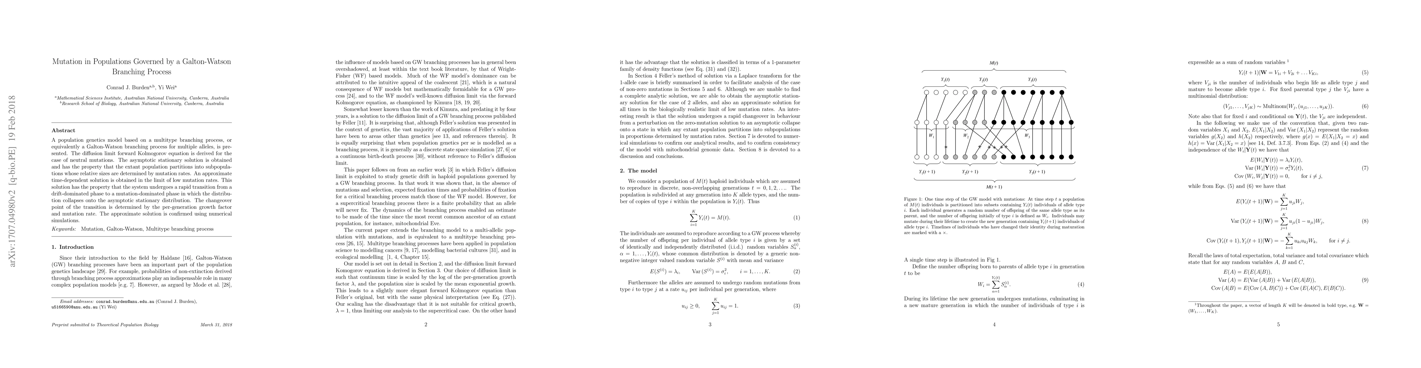 This paper presents a population genetics model based on a multitype Galton-Watson branching process, deriving a diffusion limit equation for neutral mutations. It finds an asymptotic stationary solution where population subpopulations are determined by mutation rates, and provides an approximate time-dependent solution showing a rapid transition from drift to mutation dominance, confirmed by numerical simulations.