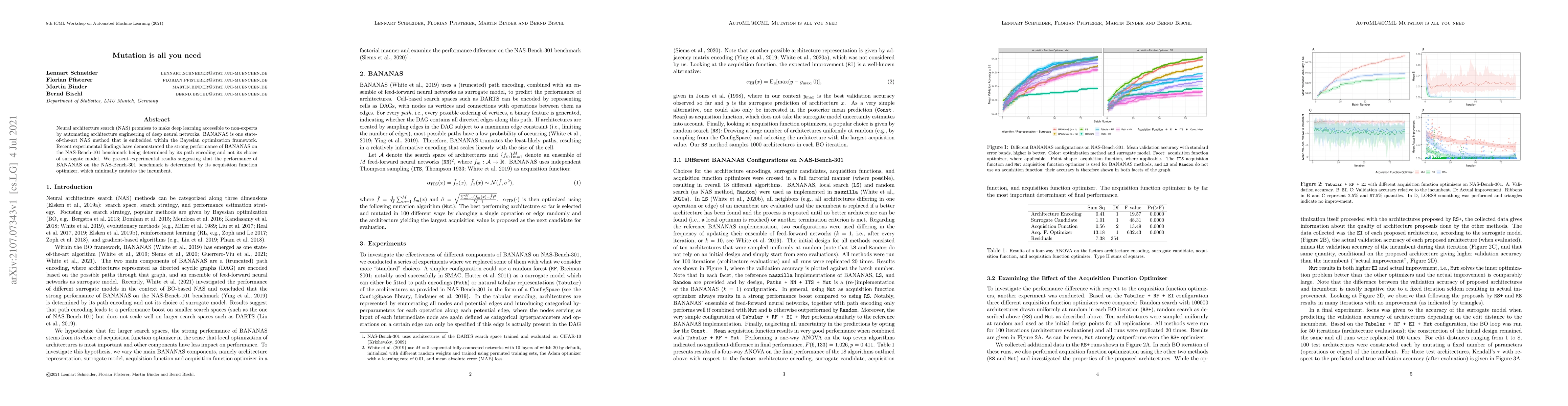 Neural architecture search (NAS) promises to make deep learning accessible to non-experts by automating architecture engineering of deep neural networks. BANANAS is one state-of-the-art NAS method that is embedded within the Bayesian optimization framework. Recent experimental findings have demonstrated the strong performance of BANANAS on the NAS-Bench-101 benchmark being determined by its path encoding and not its choice of surrogate model. We present experimental results suggesting that the performance of BANANAS on the NAS-Bench-301 benchmark is determined by its acquisition function optimizer, which minimally mutates the incumbent.