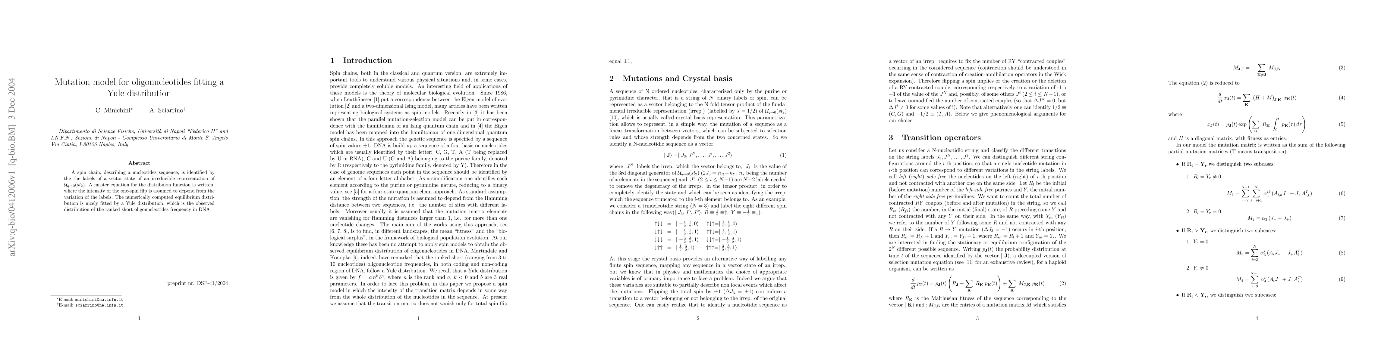 A spin chain, describing a nucleotides sequence, is identified by the labels of a vector state of an irreducible representation of U_q->0(sl2). A master equation for the distribution function is written, where the intensity of the one-spin flip is assumed to depend on the variation of the labels. The numerically computed equilibrium distribution is nicely fitted by a Yule distribution, which is the observed distribution of the ranked short oligonucleotides frequency in DNA