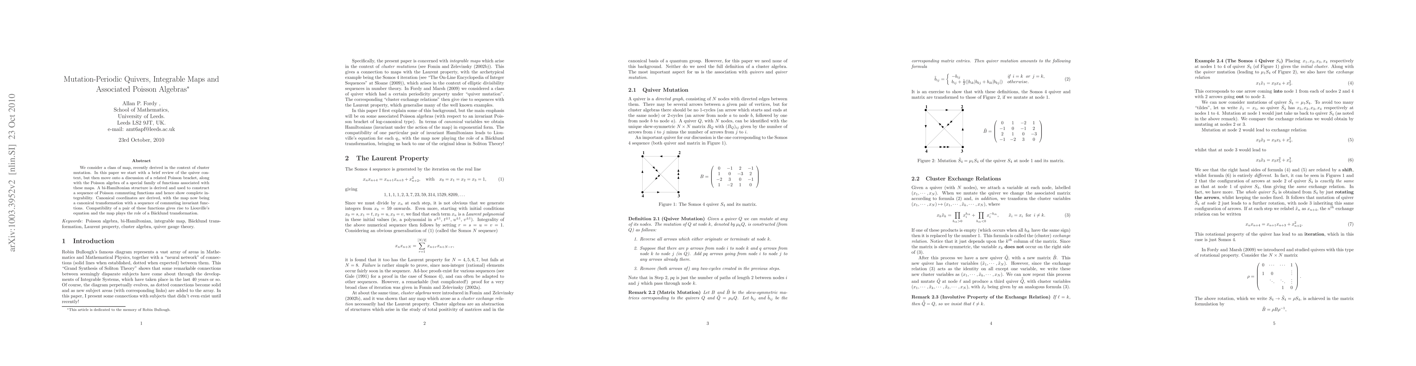 We consider a class of map, recently derived in the context of cluster mutation. In this paper we start with a brief review of the quiver context, but then move onto a discussion of a related Poisson bracket, along with the Poisson algebra of a special family of functions associated with these maps. A bi-Hamiltonian structure is derived and used to construct a sequence of Poisson commuting functions and hence show complete integrability. Canonical coordinates are derived, with the map now being a canonical transformation with a sequence of commuting invariant functions. Compatibility of a pair of these functions gives rise to Liouville's equation and the map plays the role of a B\"acklund transformation.