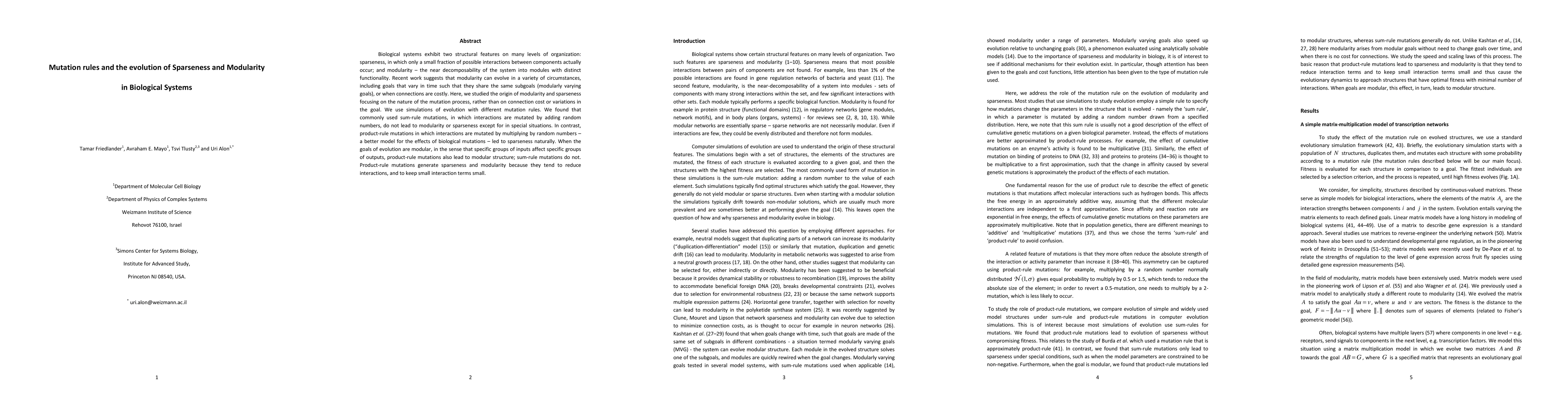 This paper investigates how different mutation rules influence the evolution of sparseness and modularity in biological systems. It finds that product-rule mutations, which multiply interactions by random numbers, naturally lead to sparseness and modularity, while sum-rule mutations, which add random numbers, do not, except under specific conditions.