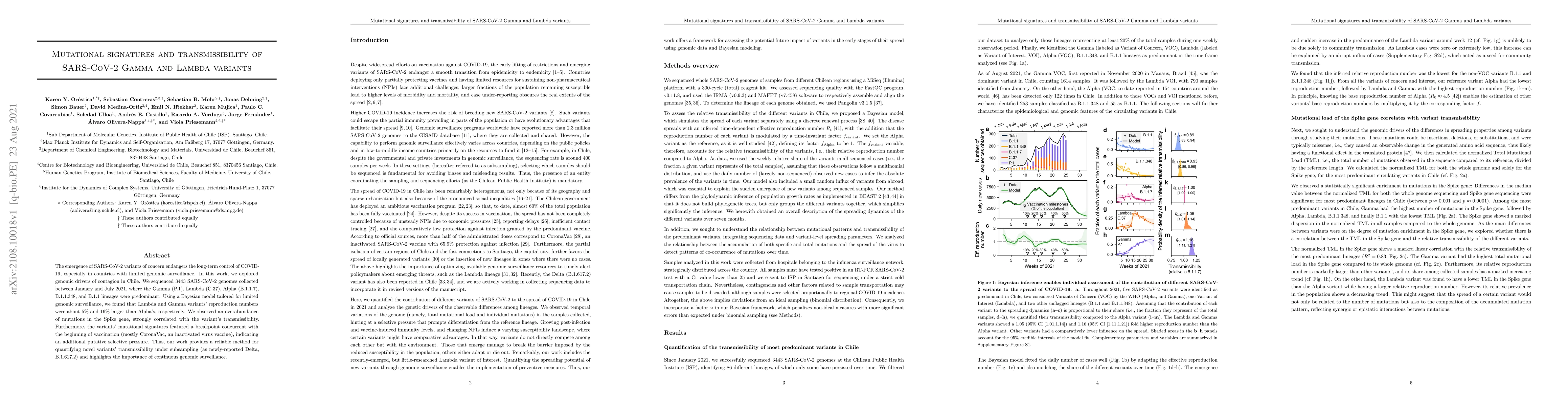 This study sequenced 3443 SARS-CoV-2 genomes from Chile to analyze the transmissibility of Gamma and Lambda variants, finding they were 5% and 16% more transmissible than Alpha, respectively. The Spike gene's mutations correlated strongly with transmissibility, and a mutational signature breakpoint coincided with the start of vaccination, suggesting additional selective pressure.