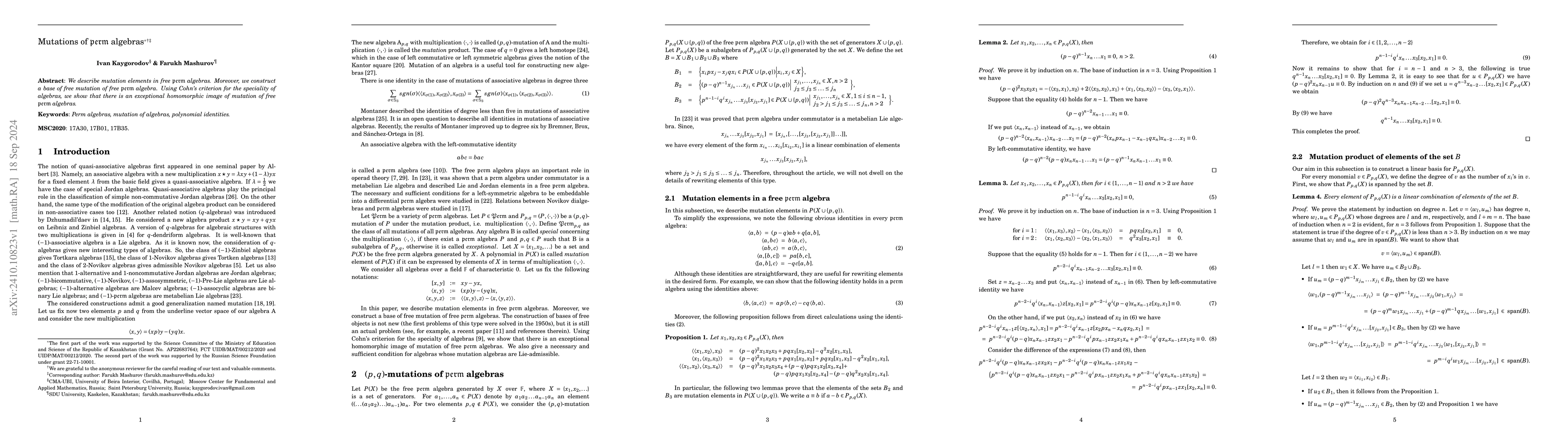 This paper discusses mutation elements in free $\mathfrak{perm}$ algebras and constructs a basis for their free mutation. It utilizes Cohn's criterion to demonstrate the existence of an exceptional homomorphic image resulting from these mutations.