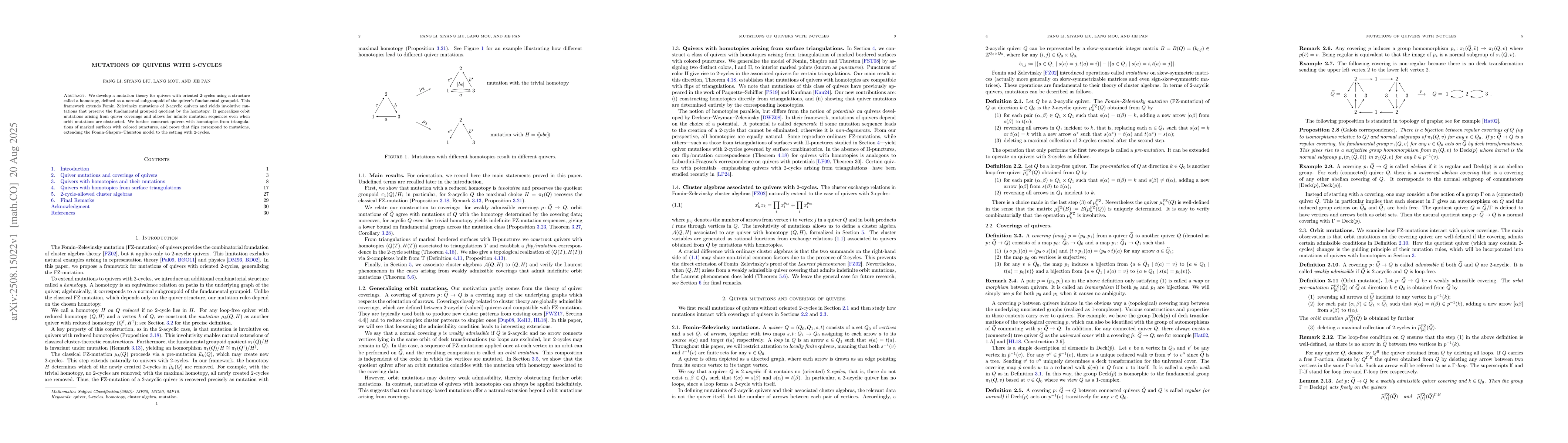 We develop a mutation theory for quivers with oriented 2-cycles using a structure called a homotopy, defined as a normal subgroupoid of the quiver's fundamental groupoid. This framework extends Fomin-Zelevinsky mutations of 2-acyclic quivers and yields involutive mutations that preserve the fundamental groupoid quotient by the homotopy. It generalizes orbit mutations arising from quiver coverings and allows for infinite mutation sequences even when orbit mutations are obstructed. We further construct quivers with homotopies from triangulations of marked surfaces with colored punctures, and prove that flips correspond to mutations, extending the Fomin-Shapiro-Thurston model to the setting with 2-cycles.