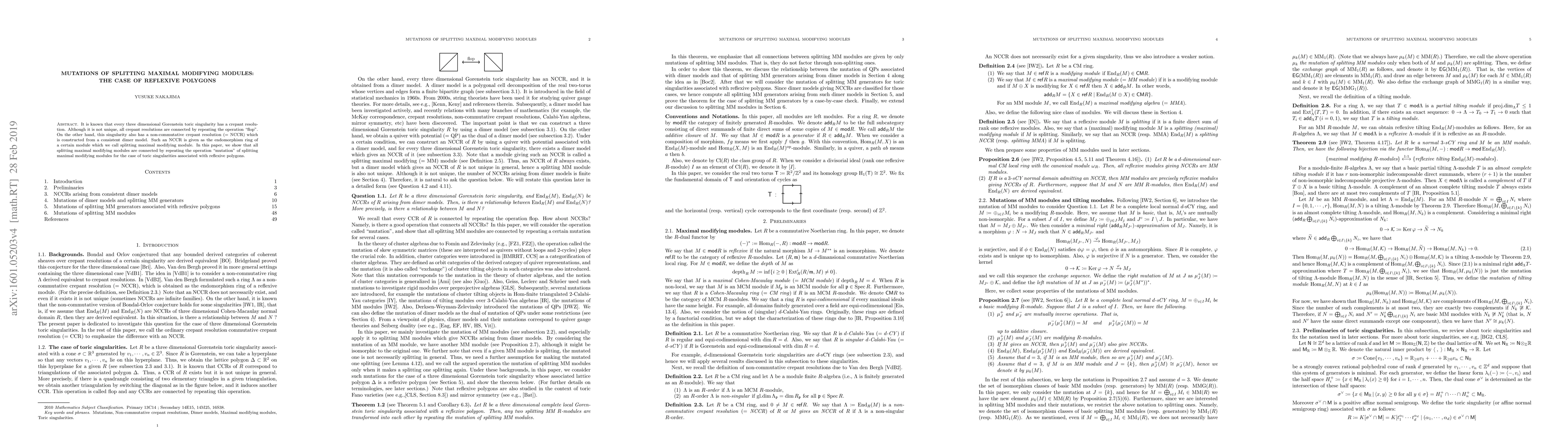 Researchers found that splitting maximal modifying modules for toric singularities associated with reflexive polygons can be transformed into each other through a process called mutation, similar to how crepant resolutions are connected by flopping.