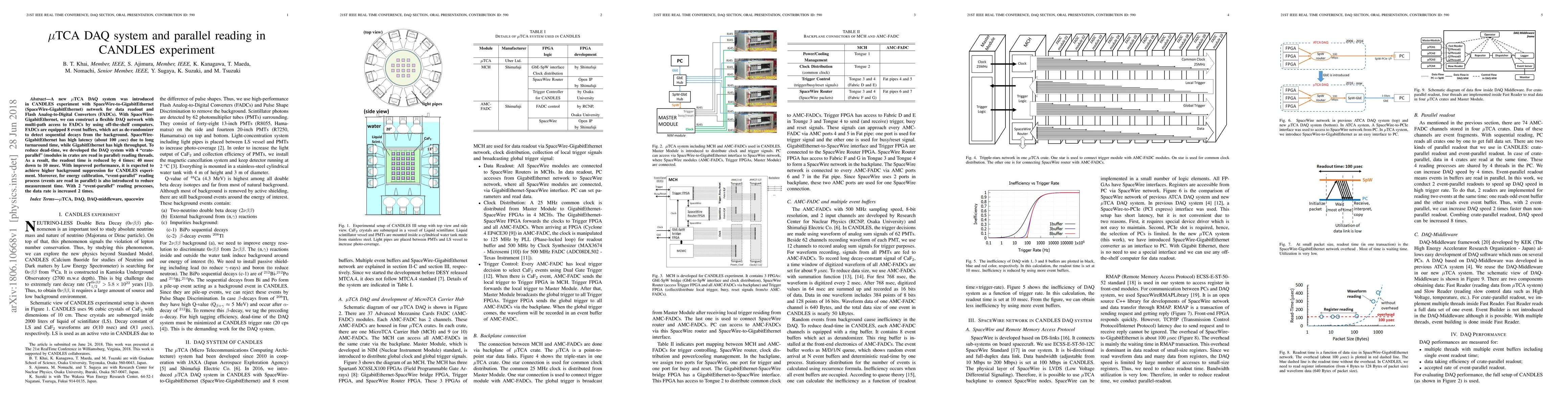 A new $\mu$TCA DAQ system was introduced in CANDLES experiment with SpaceWire-to-GigabitEthernet (SpaceWire-GigabitEthernet) network for data readout and Flash Analog-to-Digital Converters (FADCs). With SpaceWire-GigabitEthernet, we can construct a flexible DAQ network with multi-path access to FADCs by using off-the-shelf computers. FADCs are equipped 8 event buffers, which act as de-randomizer to detect sequential decays from the background. SpaceWire-GigabitEthernet has high latency (about 100 $\mu$sec) due to long turnaround time, while GigabitEthernet has high throughput. To reduce dead-time, we developed the DAQ system with 4 "crate-parallel" (modules in crates are read in parallel) reading threads. As a result, the readout time is reduced by 4 times: 40 msec down to 10 msec. With improved performance, it is expected to achieve higher background suppression for CANDLES experiment. Moreover, for energy calibration, "event-parallel" reading process (events are read in parallel) is also introduced to reduce measurement time. With 2 "event-parallel" reading processes, the data rate is increased 2 times.