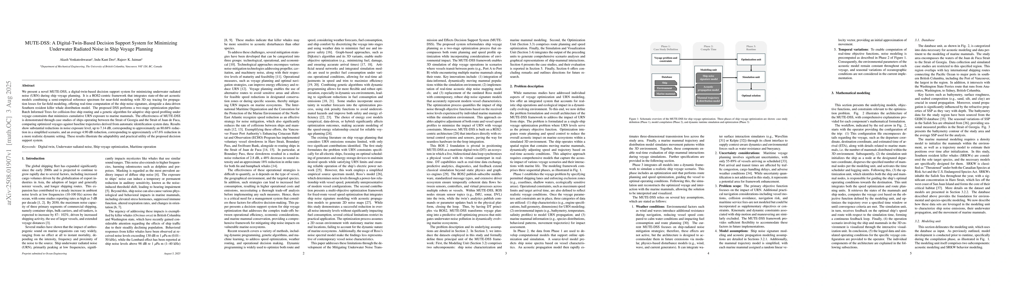 We present a novel MUTE-DSS, a digital-twin-based decision support system for minimizing underwater radiated noise (URN) during ship voyage planning. It is a ROS2-centric framework that integrates state-of-the-art acoustic models combining a semi-empirical reference spectrum for near-field modeling with 3D ray tracing for propagation losses for far-field modeling, offering real-time computation of the ship noise signature, alongside a data-driven Southern resident killer whale distribution model. The proposed DSS performs a two-stage optimization pipeline: Batch Informed Trees for collision-free ship routing and a genetic algorithm for adaptive ship speed profiling under voyage constraints that minimizes cumulative URN exposure to marine mammals. The effectiveness of MUTE-DSS is demonstrated through case studies of ships operating between the Strait of Georgia and the Strait of Juan de Fuca, comparing optimized voyages against baseline trajectories derived from automatic identification system data. Results show substantial reductions in noise exposure level, up to 7.14 dB, corresponding to approximately an 80.68% reduction in a simplified scenario, and an average 4.90 dB reduction, corresponding to approximately a 67.6% reduction in a more realistic dynamic setting. These results illustrate the adaptability and practical utility of the proposed decision support system.
