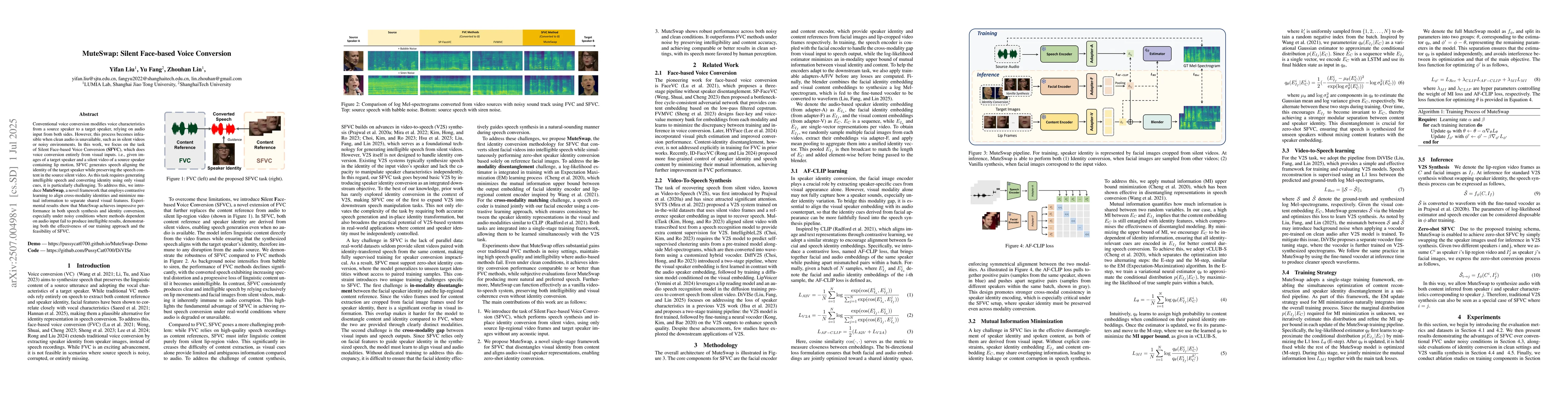 The paper introduces MuteSwap, a framework for Silent Face-based Voice Conversion (SFVC), which generates speech from visual inputs alone, aligning it with a target speaker's voice while preserving the source's content. MuteSwap uses contrastive learning to match cross-modal identities and minimize shared visual features. It outperforms audio-dependent methods, especially in noisy conditions, proving the effectiveness of this visual-to-speech conversion approach.