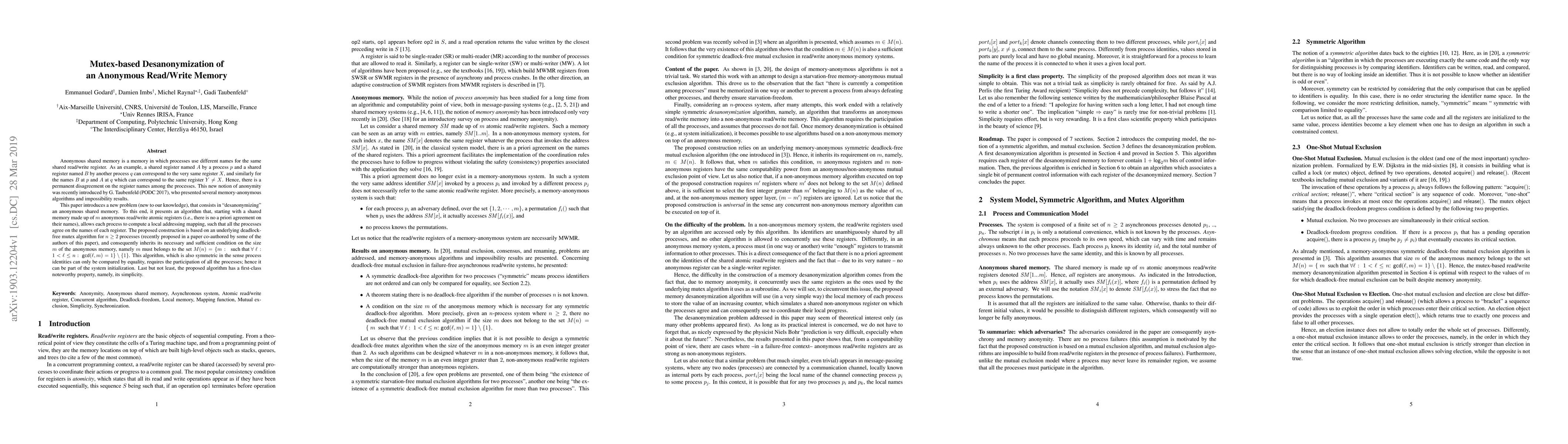This paper proposes an algorithm to desanonymize an anonymous shared memory by enabling processes to agree on register names using a mutex-based approach. The algorithm requires all processes to participate and is based on a deadlock-free mutex algorithm, ensuring the size of the memory adheres to specific conditions.