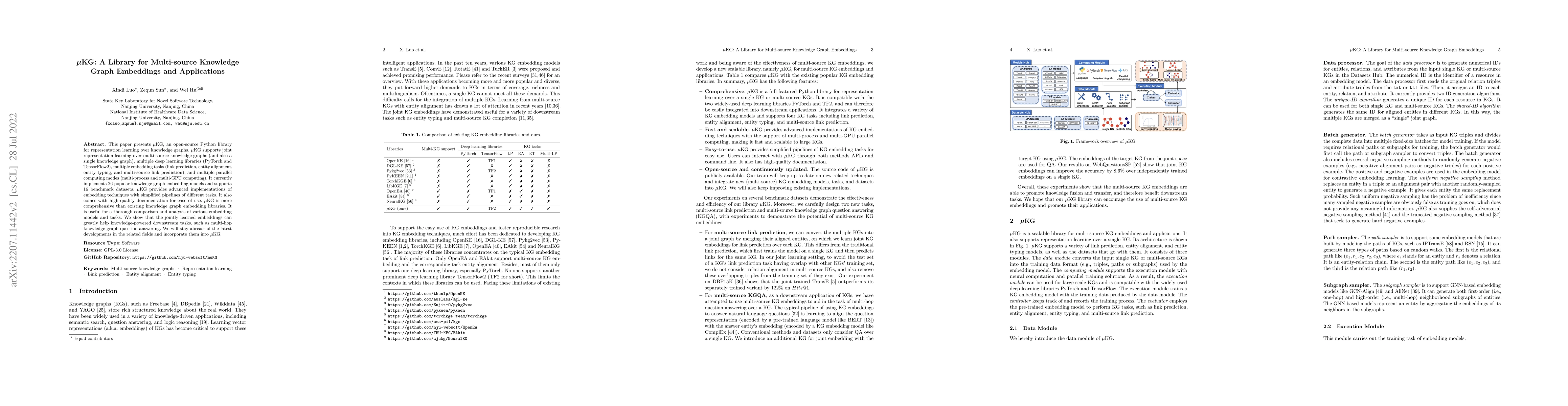 $\mu\text{KG}$ is an open-source Python library for multi-source knowledge graph embedding, supporting various tasks and computing modes, and implementing 26 popular models to facilitate comprehensive model and task comparisons. It aids downstream knowledge-powered tasks, like multi-hop question answering, and will continuously update with the latest developments.