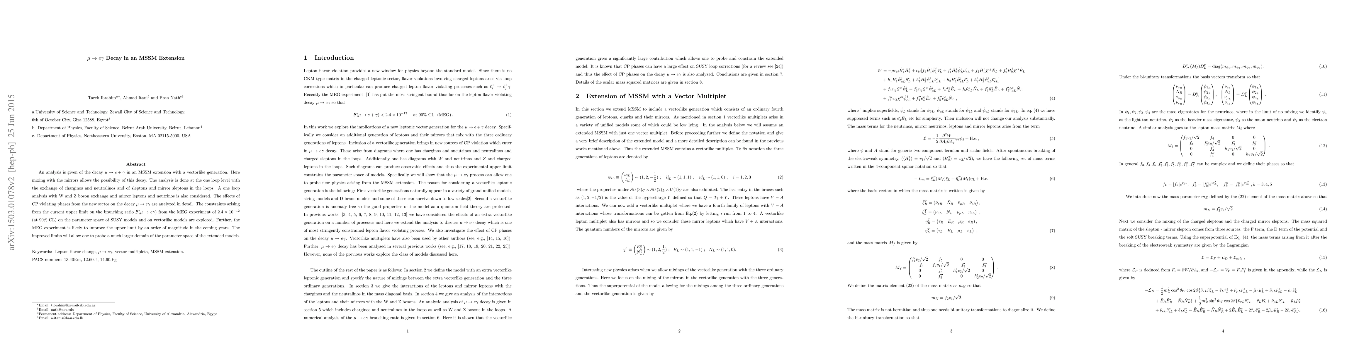 An analysis is given of the decay $\mu \to e+ \gamma$ in an MSSM extension with a vectorlike generation. Here mixing with the mirrors allows the possibility of this decay. The analysis is done at the one loop level with the exchange of charginos and neutralinos and of sleptons and mirror sleptons in the loops. A one loop analysis with W and Z boson exchange and mirror leptons and neutrinos is also considered. The effects of CP violating phases from the new sector on the decay $\mu\to e \gamma$ are analyzed in detail. The constraints arising from the current upper limit on the branching ratio ${\cal{B}}(\mu\to {e} \gamma)$ from the MEG experiment of $2.4\times 10^{-12}$ (at 90\% CL) on the parameter space of SUSY models and on vectorlike models are explored. Further, the MEG experiment is likely to improve the upper limit by an order of magnitude in the coming years. The improved limits will allow one to probe a much larger domain of the parameter space of the extended models.