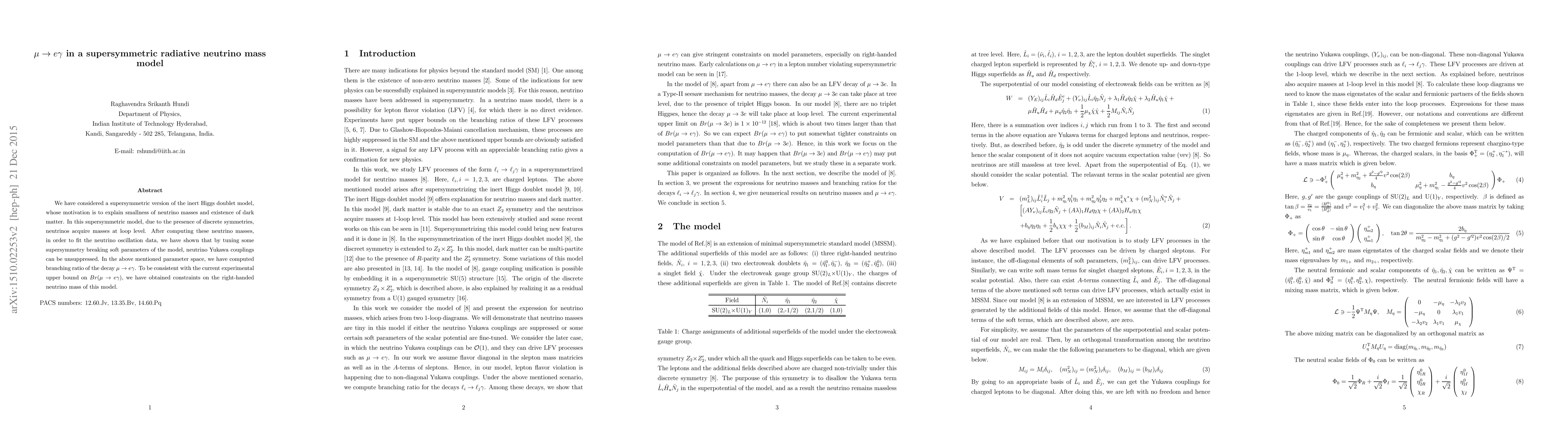 This paper explores a supersymmetric version of the inert Higgs doublet model to explain small neutrino masses and dark matter, showing that tuning certain parameters can lead to unsuppressed neutrino Yukawa couplings. It computes the branching ratio for the decay $\mu\to e\gamma$ and derives constraints on the right-handed neutrino mass to comply with experimental limits.