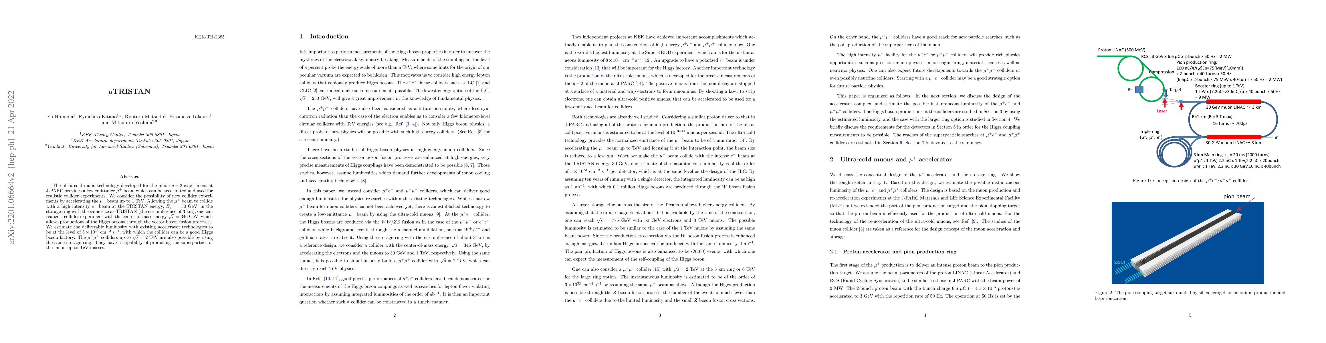 The $\mu$TRISTAN project proposes utilizing ultra-cold muon beams from the muon $g-2$ experiment to create a collider capable of reaching 346 GeV center-of-mass energy by colliding $\mu^+$ beams with 30 GeV $e^-$ beams, functioning as a high-luminosity Higgs boson factory. Additionally, $\mu^+ \mu^+$ collisions up to 2 TeV can be achieved, enabling the production of muon superpartners.