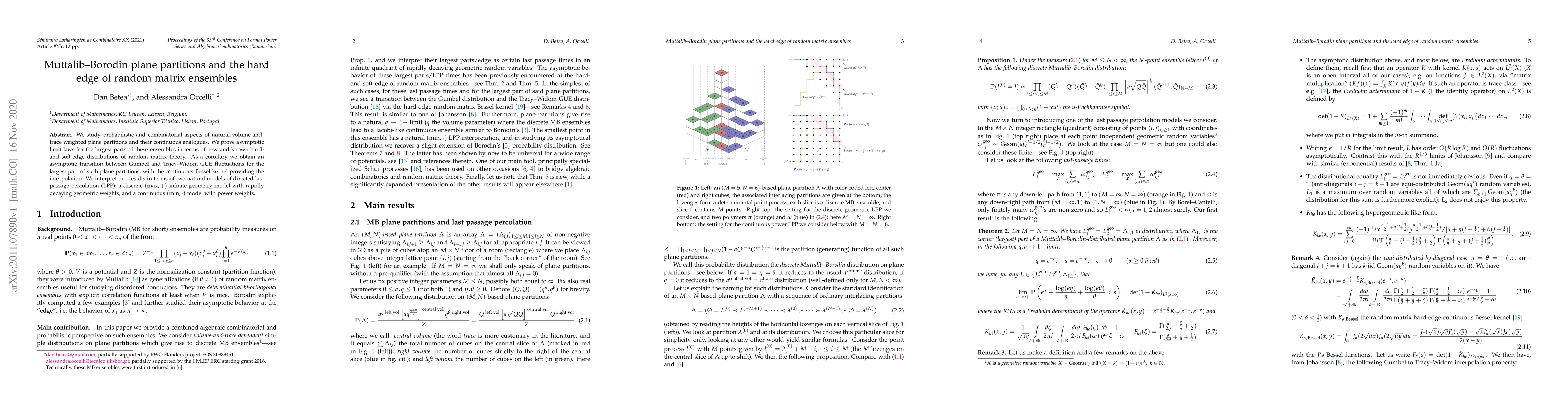 This paper investigates the probabilistic and combinatorial properties of volume-and-trace weighted plane partitions and their continuous analogues, proving asymptotic limit laws for their largest parts in terms of random matrix theory's hard- and soft-edge distributions. The study also reveals an asymptotic transition between Gumbel and Tracy-Widom fluctuations for the largest part, with the continuous Bessel kernel acting as an interpolator.