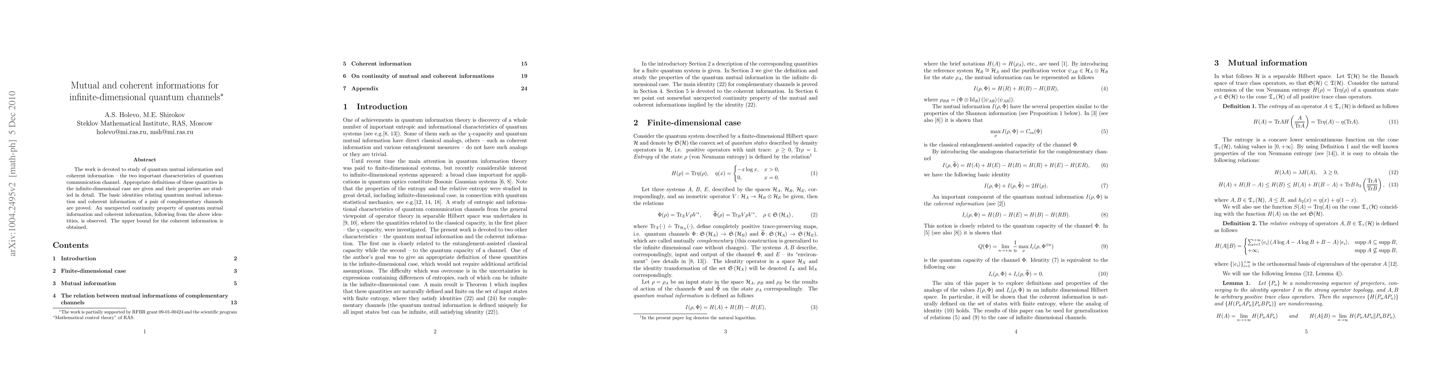The work is devoted to study of quantum mutual information and coherent information -- the two important characteristics of quantum communication channel. Appropriate definitions of these quantities in the infinite-dimensional case are given and their properties are studied in detail. Basic identities relating quantum mutual information and coherent information of a pair of complementary channels are proved. An unexpected continuity property of quantum mutual information and coherent information following from the above identities is observed. An upper bound for the coherent information is obtained.
