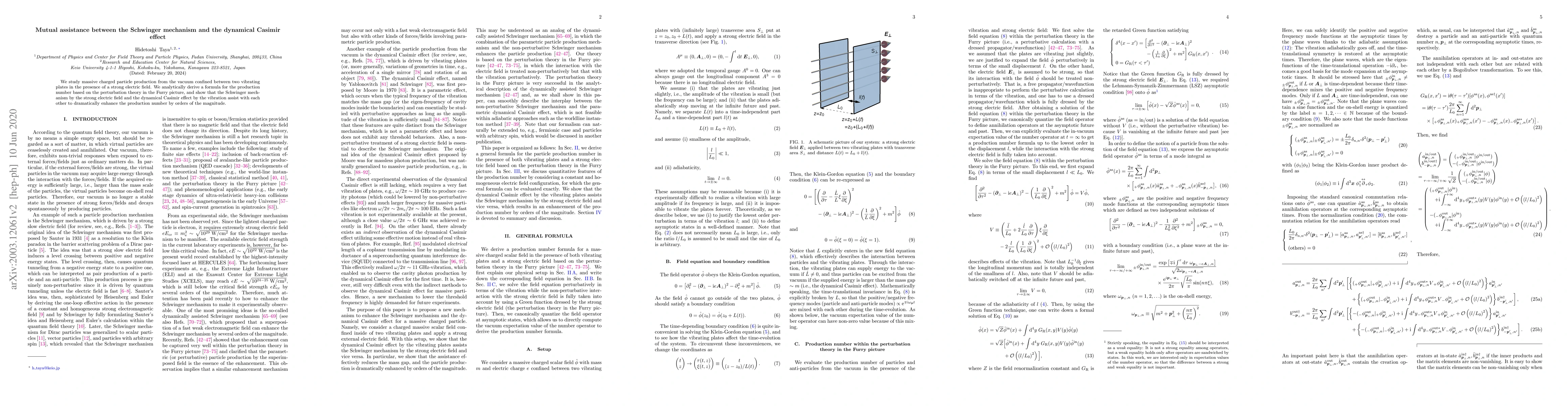 The Schwinger mechanism and dynamical Casimir effect enhance massive charged particle production in a vacuum between vibrating plates with strong electric fields, increasing production numbers by orders of magnitude.