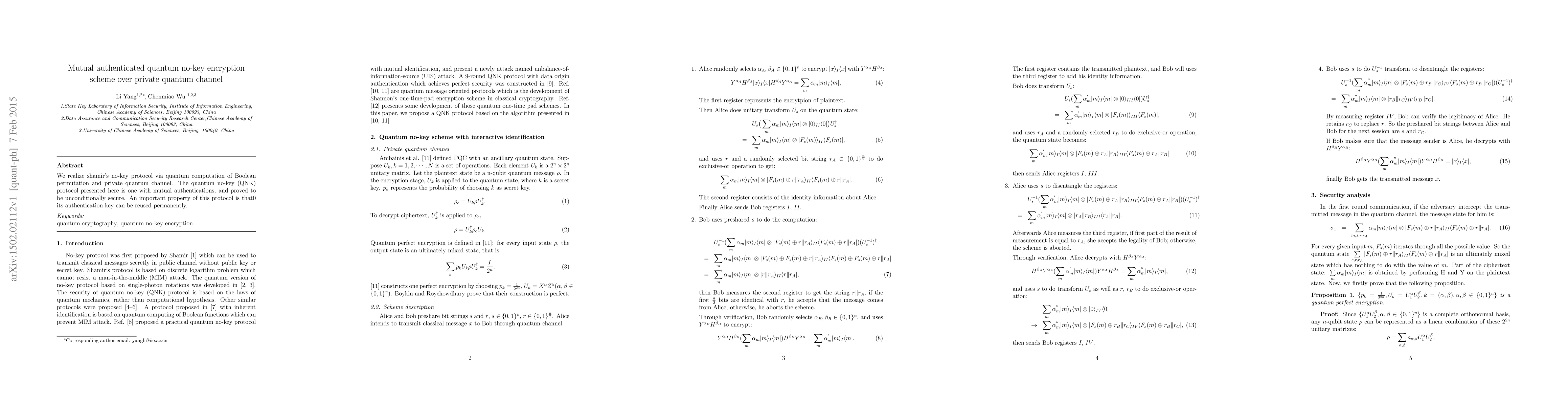 Researchers developed a secure quantum no-key encryption scheme that uses mutual authentication over private quantum channels, offering unconditional security with reusable authentication keys.