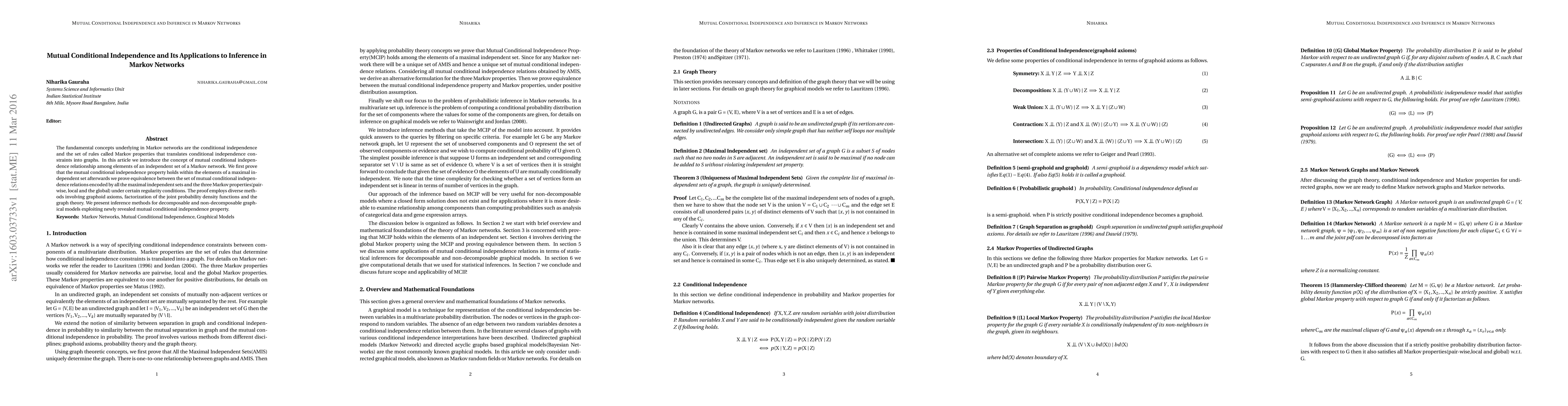 This paper introduces mutual conditional independence in Markov networks, proving its equivalence to the three Markov properties under certain conditions. It also presents inference methods leveraging this property for both decomposable and non-decomposable graphical models.